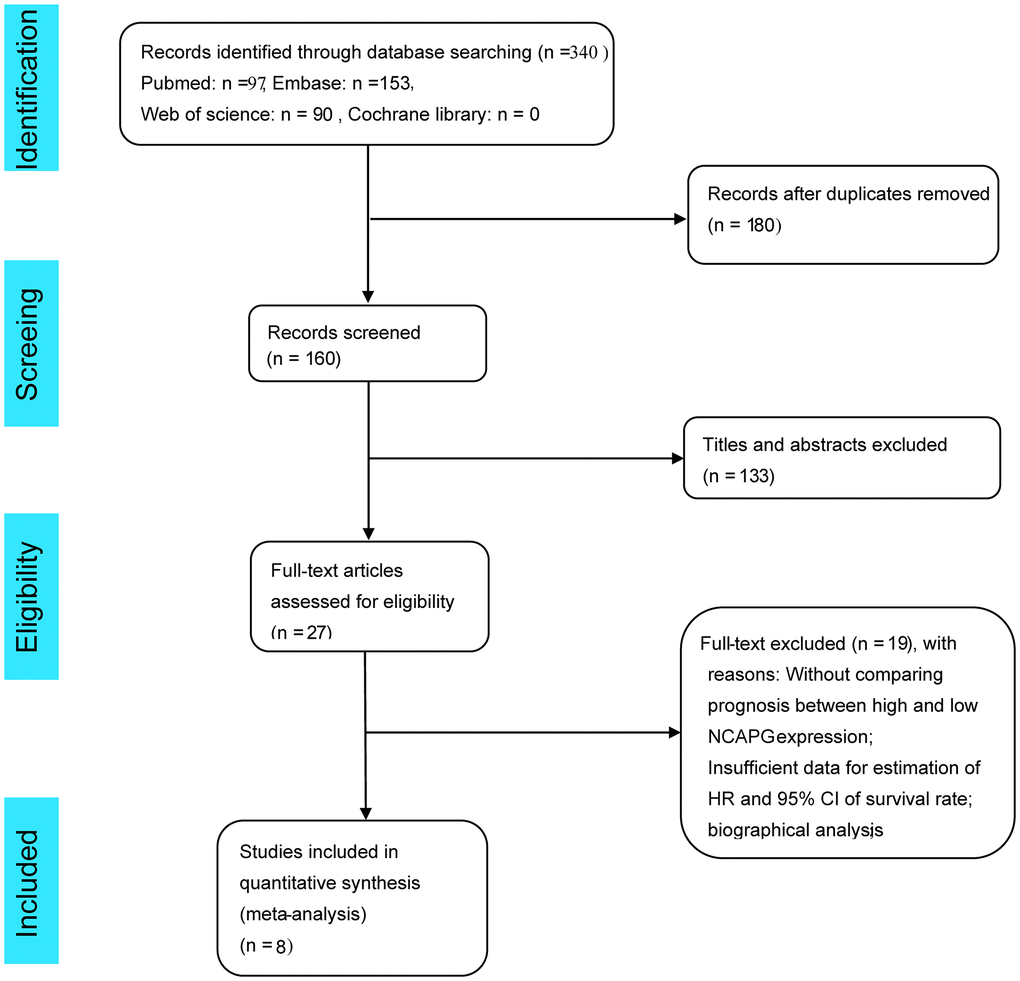 The exclusion criteria were as follows: (1) reviews, publication letters, retracted literature, and case reports; (2) insufficient data; (3) bioinformatics analysis; and (4) studies not relevant to NCAPG.