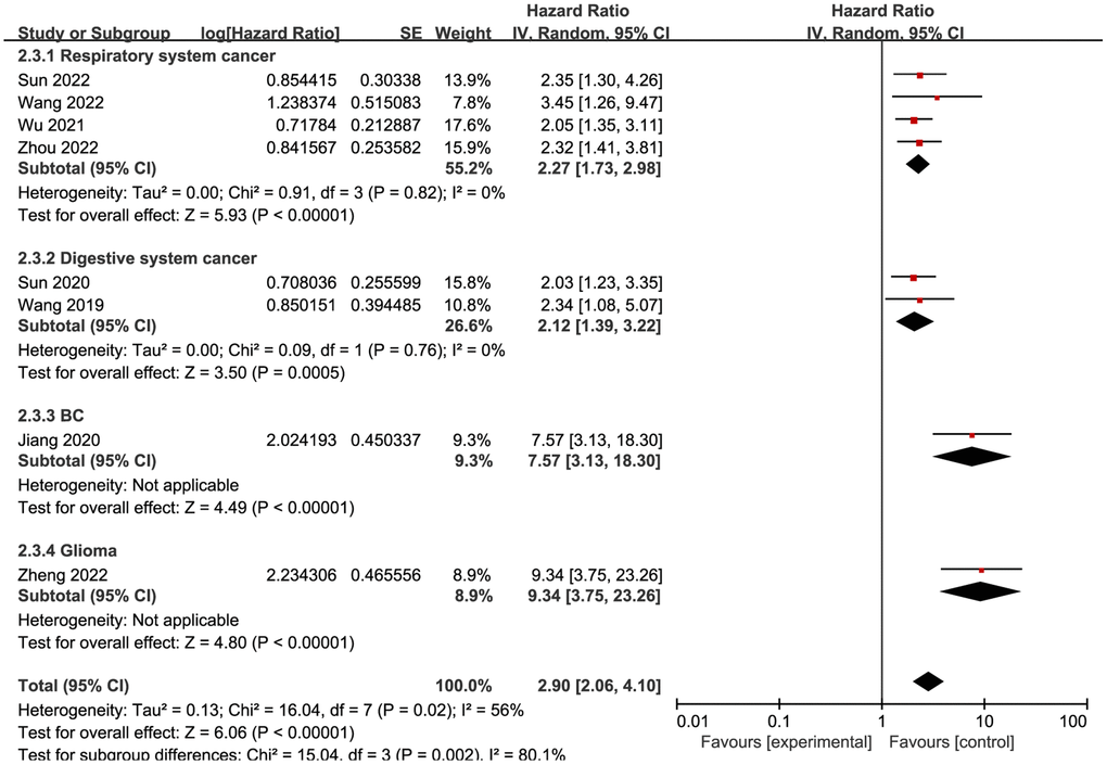 Eight studies reported that NCAPG upregulation was associated with tumors. Therefore, a pooled analysis of the eight studies was performed. As shown in Figure 2, a random model was used because of the absence of obvious heterogeneity (I2 = 56%, P = 0.02). The pooled results suggested that high NCAPG expression rates were correlated with worse OS in patients with different cancers (HR = 2.90, 95% confidence interval (CI) = 2.06–4.10, P < 0.00001).