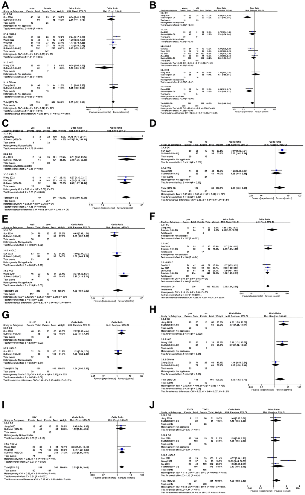 As all studies included in this meta-analysis reported clinicopathological parameters, we analyzed the high expression of NCAPG and these parameters. As shown in Figure 3, the upregulation of NCAPG was not significantly correlated with gender (male vs. female, odds ratio (OR) = 1.20, 95% CI = 0.92–1.56, P = 0.19, fixed model; Figure 3A), age (young vs. old, OR = 0.68, 95% CI = 0.44–1.06, P = 0.09, random model; Figure 3B), vascular invasion (yes vs. no, OR = 2.23, 95% CI = 0.81–6.11, P = 0.12, random model; Figure 3D), differentiation (well differentiated vs. poorly differentiated, OR = 1.20, 95% CI = 0.50–2.90, P = 0.68, fixed model; Figure 3E), TNM stage (III–IV vs. I–II, OR = 1.64, 95% CI = 0.92–2.92, P = 0.09, random model; Figure 3G), or T classification (T3+T4 vs. T1+T2, OR = 1.68, 95% CI = 0.83–3.40, P = 0.15, random model; Figure 3J), although it was correlated with distant metastasis (yes vs. no, OR = 5.65, 95% CI 2.60–12.26, P < 0.0001, fixed model; Figure 3C), lymph node metastasis (yes vs. no, OR = 2.08, 95% CI = 1.54–2.80, P < 0.00001, fixed model; Figure 3F), relapse (yes vs. no, OR = 2.62, 95% CI = 1.02–6.70, P = 0.04, random model; Figure 3H), and clinical stage (III–IV vs. I–II, OR = 2.23, 95% CI = 1.44–3.44, P = 0.0003, fixed model; Figure 3I). The results of database validation of the clinicopathological characteristics and NCAPG expression data (Supplementary Figure 1) are consistent with most of our previous meta-analysis results.
