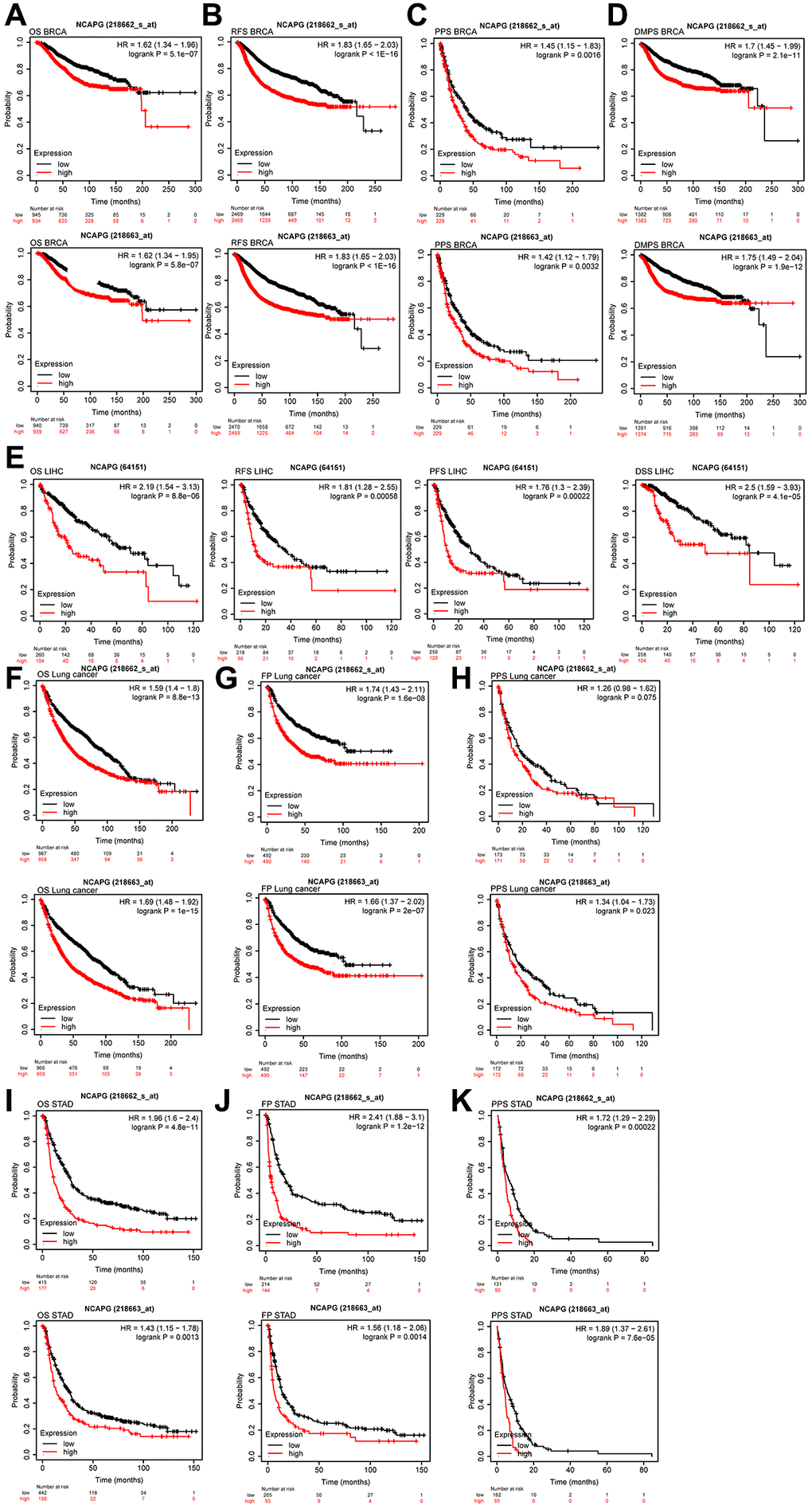 We evaluated the NCAPG expression levels and performed a survival analysis in various cancers using the GEPIA2.0 database to validate our results. The findings showed that, compared with normal tissues, the expression of NCAPG was significantly upregulated in tumors, including BRCA, GBM, LIHC, LUAD, LUSC, and STAD (Figure 5A). We next performed a univariate Cox survival analysis on the above tumors, and it showed that the OS of LIHC and LUAD was related to NCAPG (Figure 5B). The progression-free survival (PFS) of BRCA, LIHC, LUAD, and STAD was related to NCAPG (Figure 5C). The relapse-free survival (RFS) of LIHC, LUSC, and STAD was related to NCAPG (Figure 5D), and the disease-specific survival (DSS) of LIHC and LUAD was related to NCAPG (Figure 5E). We then performed receiver operating characteristic (ROC) survival analysis of the data on the above tumors (Supplementary Figure 3), and the area under the curve of GBM, LIHC, and STAD was greater than 0.7. Therefore, we concluded that NCAPG may be a good prognostic indicator of various cancers. In addition, we analyzed the survival prognosis of the above tumors using the Kaplan-Meier plotter database based on the median cutoff value of NCAPG expression (including probes 218663_at and 218663_s_at) in cancer. The results showed that NCAPG expression can be used to predict OS in breast cancer (P < 0.01; Figure 6A), RFS (P < 0.01; Figure 6B), PPS (P < 0.01; Figure 6C), DMFS (P < 0.01; Figure 6D), liver cancer, PFS, PFS, and DSS (P < 0.01; Figure 6E), lung cancer (P < 0.01; Figure 6F), FP (P < 0.01; Figure 6G), and PPS (P < 0.01; Figure 6H), gastric cancer (P < 0.01; Figure 6I), FP (P < 0.01; Figure 6J,), and PPS (P < 0.01; Figure 6K). Moreover, the findings were validated against multiple cancer datasets using the PrognoScan database. We collected 29 datasets on breast and lung cancers. As shown in Table 3, NCAPG expression in these tumors significantly affected prognosis-related indicators, such as OS, DSS, RFS, and PFS (P < 0.05).