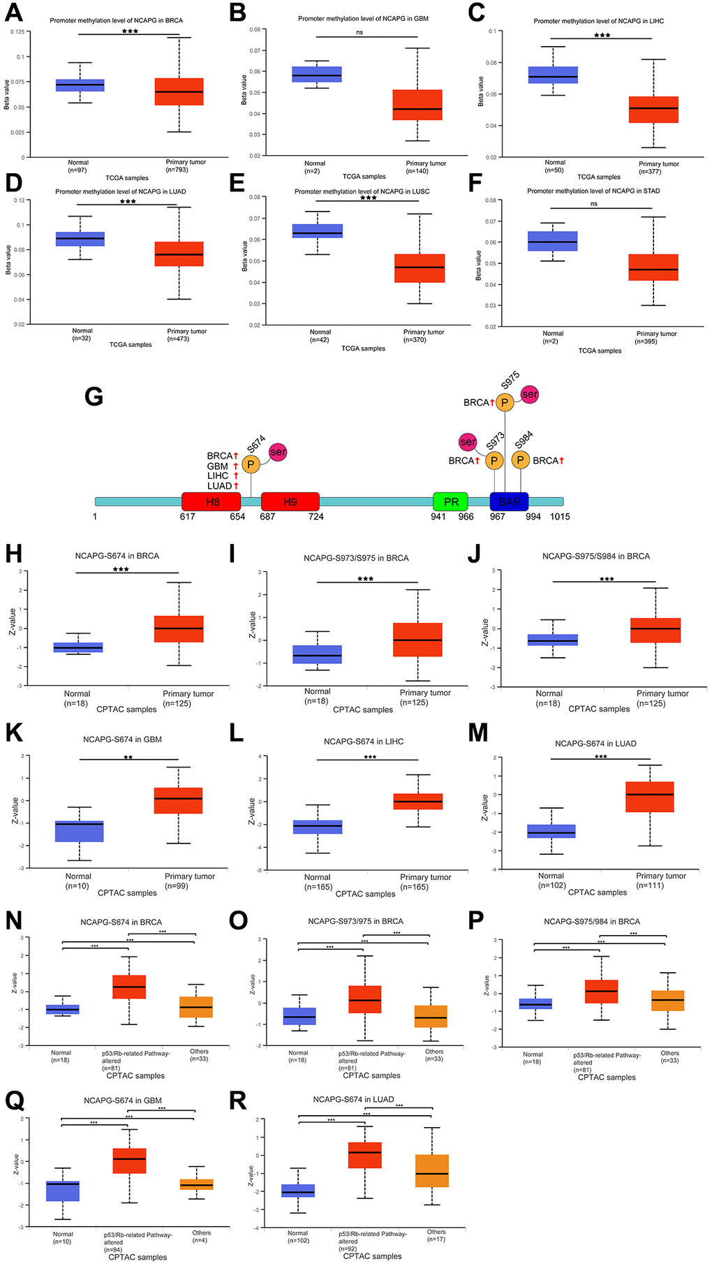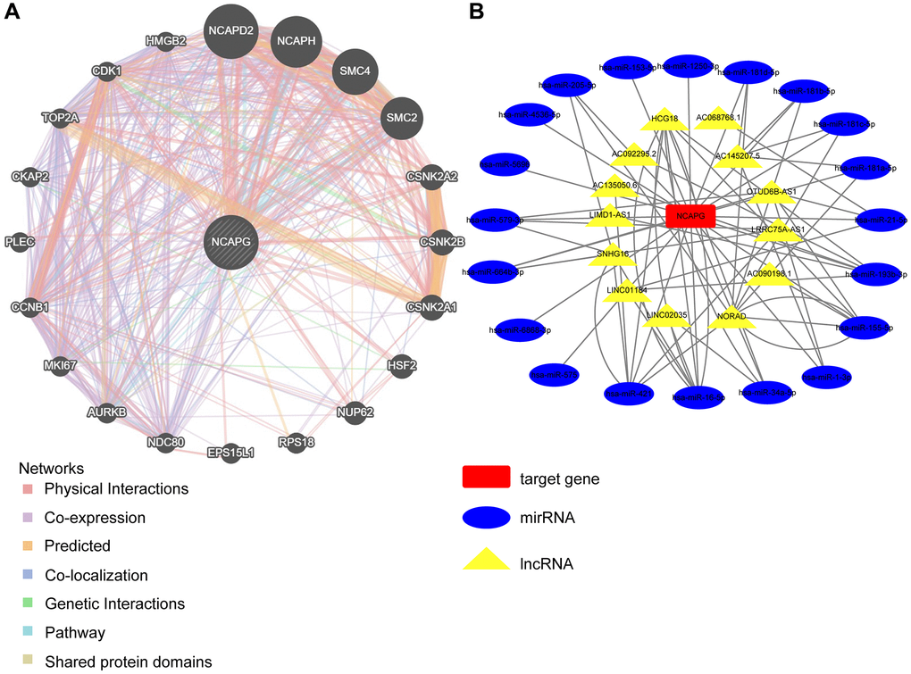 We also analyzed the GO and KEGG pathways of NCAPG. The richest GO terms were nuclear division, cell division, and cell cycle processes, all of which are related to cancer cell proliferation. In addition, KEGG pathway analysis confirmed that NCAPG-related genes were involved in the p53 signaling pathway, cell senescence, and cell cycle, which are involved in the mechanism underlying carcinogenesis. We also explored the changes in phosphorylation and methylation of NCAPG in these tumors. Finally, we identified the miRNAs and lncRNAs related to NCAPG.