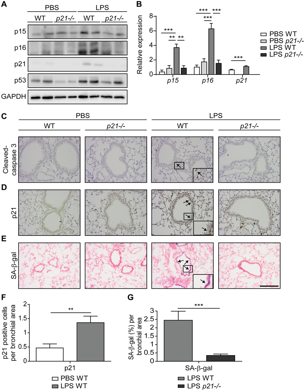 Senescent cells exacerbate chronic bronchitis pathology and their elimination limits the disease progression [26]. Furthermore, p21 silencing results in elimination of senescent cells via apoptosis [60]. To determine the effect of p21 knockout on accumulation of senescent bronchial epithelial cells we evaluated lung sections stained for the apoptotic marker cleaved caspase-3, a cellular senescence marker p21, and for SA-β-gal activity (Figure 1C–1E). Neither WT nor p21-/- mice presented caspase-3 cleavage following chronic LPS exposure (Figure 1C and Supplementary Figure 1B - positive control), suggesting that the bronchial epithelial cells do not undergo significant apoptosis in our experimental end-point. The immunoblot analysis of the cleavage caspase-3 did not reveal a significant difference in expression of this marker between the genotypes (Supplementary Figure 1C). Alternatively, immunohistochemical analysis of p21 expression revealed a marked elevation in the amount of p21 expressing cells in LPS exposed WT mice, compared to the PBS exposed mice (Figure 1D, 1F). Furthermore, the levels of SA-β-gal activity in the lungs of LPS exposed WT mice were increased relative to lungs of PBS exposed mice (Figure 1E), while p21 knockout abolished this effect (Figure 1E, 1G). These results suggest that following chronic LPS exposure lung cells undergo senescence via a p21-dependent pathway.
