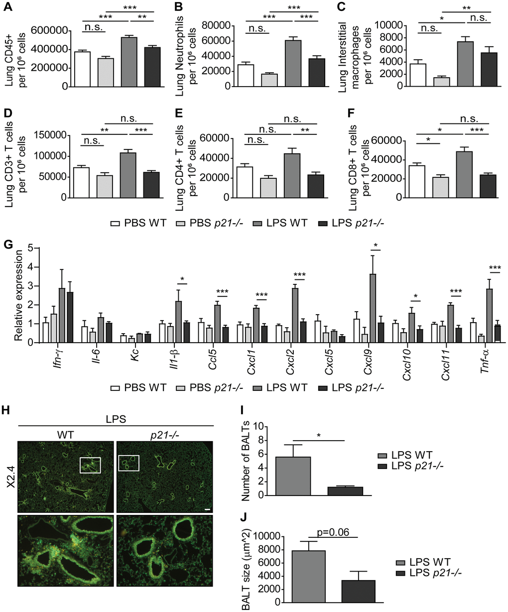 A central hallmark of chronic lung inflammation is the recruitment and accumulation of immune cells within the lung parenchyma and the bronchoalveolar lavage (BAL) fluid [9, 64]. Therefore, to determine whether p21-/- affects the chronic inflammatory response in the lungs, we examined the cellular immune response in both the lung parenchyma and the BAL fluid of mice subjected to the chronic LPS regimen. The cellular immune response and infiltration of both innate and adaptive immune cells in the mice lung parenchyma following chronic LPS exposure was assessed by flow cytometry. This analysis revealed a significantly higher influx of CD45+ immune cells (Figure 3A) in the lungs of LPS exposed WT mice compared to the PBS exposed WT mice. By analysing the presence of specific components of the immune system, we revealed a significant accumulation of neutrophils, interstitial macrophages, CD3+, CD4+, and CD8+ T cells (Figure 3B–3F) following chronic LPS exposure. Remarkably, p21 knockout resulted in a significantly lower accumulation of all these immune cell subsets (Figure 3A–3F). The inflammatory response in the lung is accompanied by an elevation in inflammatory secreted components, such as cytokines and chemokines [65–67]. To examine whether p21 knockout altered the inflammatory response in LPS-exposed mice, we analyzed the mRNA expression levels of pro-inflammatory SASP components. We observed a significant increase in the expression of Il-1β, Ccl5, Cxcl1, Cxcl2, Cxcl9, Cxcl10, Cxcl11 and Tnf-α in LPS exposed WT mice compared with PBS exposed mice, but not in p21-/- mice (Figure 3G). In both WT and p21-/- mice, however, the LPS-triggered increase in Ifn-γ, Il-6, Kc and Cxcl5 remained the same.