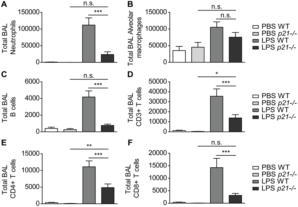 Then, we evaluated the cellular immune response in the mice BAL fluid by flow cytometry. As in the lung parenchyma, we observed a significantly higher influx of neutrophils, B cells, CD3+, CD4+ and CD8+ T cells (Figure 4A, 4C–4F), accompanied by an elevated influx of alveolar macrophages (Figure 4B) in WT LPS exposed mice compared to the PBS exposed WT mice. In contrast, a 2-fold decrease on average in the influx of these immune cell populations was observed in p21-/- LPS exposed mice (Figure 4A–4F). It, therefore, appears that p21 knockout alleviates the accumulation of immune cells in lungs, including specifically in iBALTs, following chronic LPS exposure.