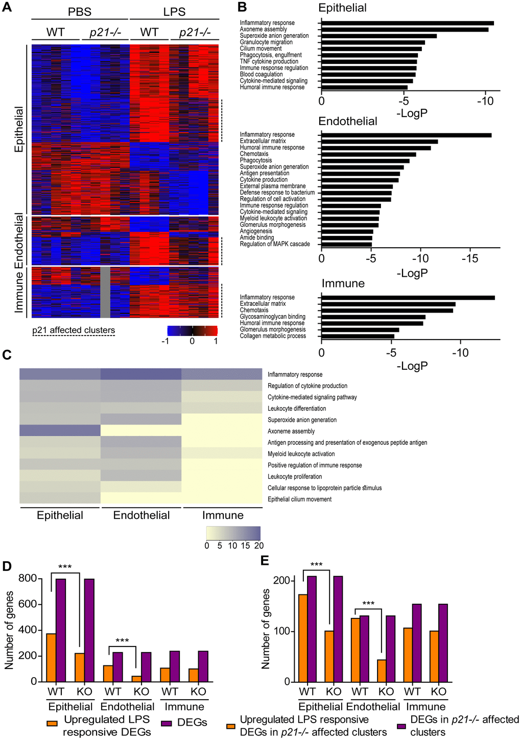 To further examine which genes are affected by p21 following LPS treatment in each cell population, we compared the upregulated DEGs following LPS treatment in both WT (LPS WT vs. PBS WT) and p21-/- (LPS p21-/- vs. PBS p21-/-) mice. First, a KEGG pathway analysis in epithelial, endothelial and immune cells revealed no differences in gene expression when comparing between PBS WT and PBS p21-/- mice. In contrast, we observed that chronic LPS exposure resulted in a significant upregulation of DEGs in WT mice compared with p21-/- mice, in the epithelial (p<0.001) and endothelial (p<0.001) cell populations, but not in the immune cells population (p=0.543) (Figure 5D). Furthermore, a KEGG pathway analysis revealed that chronic LPS exposure resulted in changes in the inflammatory response, the p53 signaling pathway and cellular senescence pathways in WT mice compared with p21-/- mice in endothelial cells (Supplementary Figure 3A).