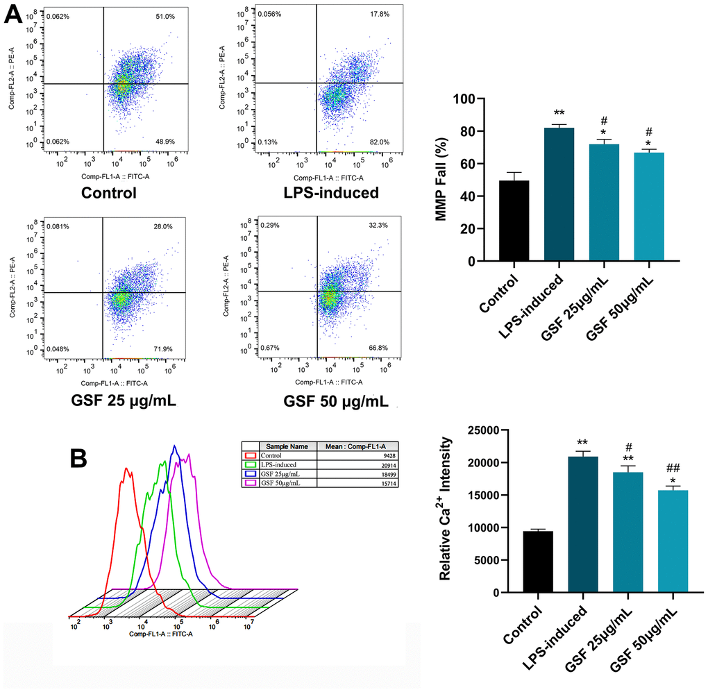When oxidative stress occurs, ROS levels increase, leading to mitochondrial dysfunction. Mitochondrial dysfunction, in turn, leads to reduced ATP production, dysregulated Ca2+ balance, and ROS production [34]. Therefore, MMP was evaluated to investigate the regulatory effect of GSF. As shown in Figure 3A, the MMP decreased rate in the LPS-induced group was significantly increased compared with that in the control group (P<0.01). In contrast, the mitochondrial membrane potential of the GSF group was significantly decreased compared to the LPS-induced group. Additionally, the 50 μg/mL group was superior to the 25 μg/mL group. It indicates that GSF can ameliorate LPS-induced MMP increase.