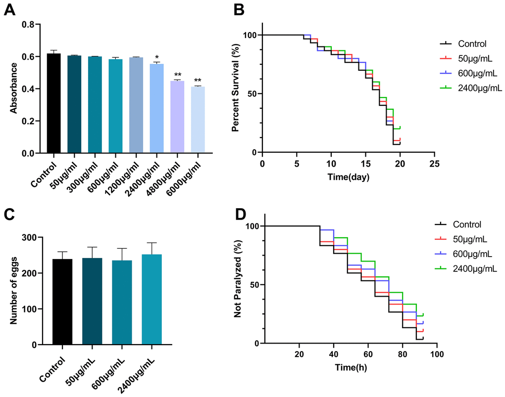To investigate the effect of GSF on the lifespan and oviposition of C. elegans, synchronized N2 worms were subjected to GSF at various concentrations (50, 600, and 2400 μg/mL). As shown in Figure 4B, 4C, GSF had no significant effect on C. elegans N2 lifespan and egg laying number (P>0.05). It revealed that concentrations of GSF ≤ 2400 μg/mL had no significant toxic effects on lifespan and oviposition.