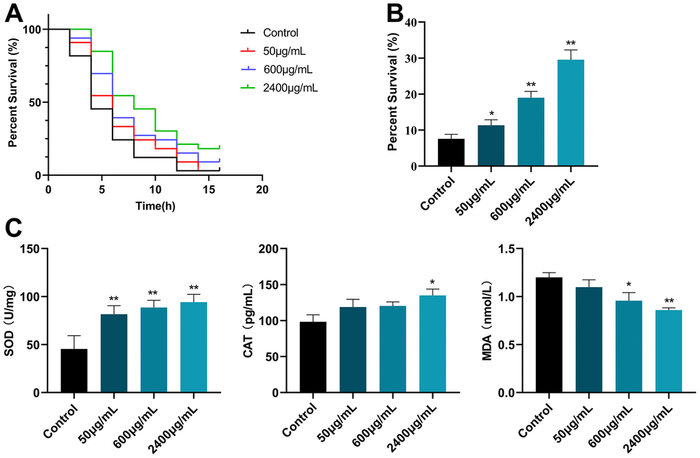Likewise, in the H2O2 oxidative stress experiment, C. elegans CL2006 was stimulated with 10 mM hydrogen peroxide, and the control group did not contain H2O2. The survival rate was recorded after 16 hours. All the experiments were repeated three times independently.