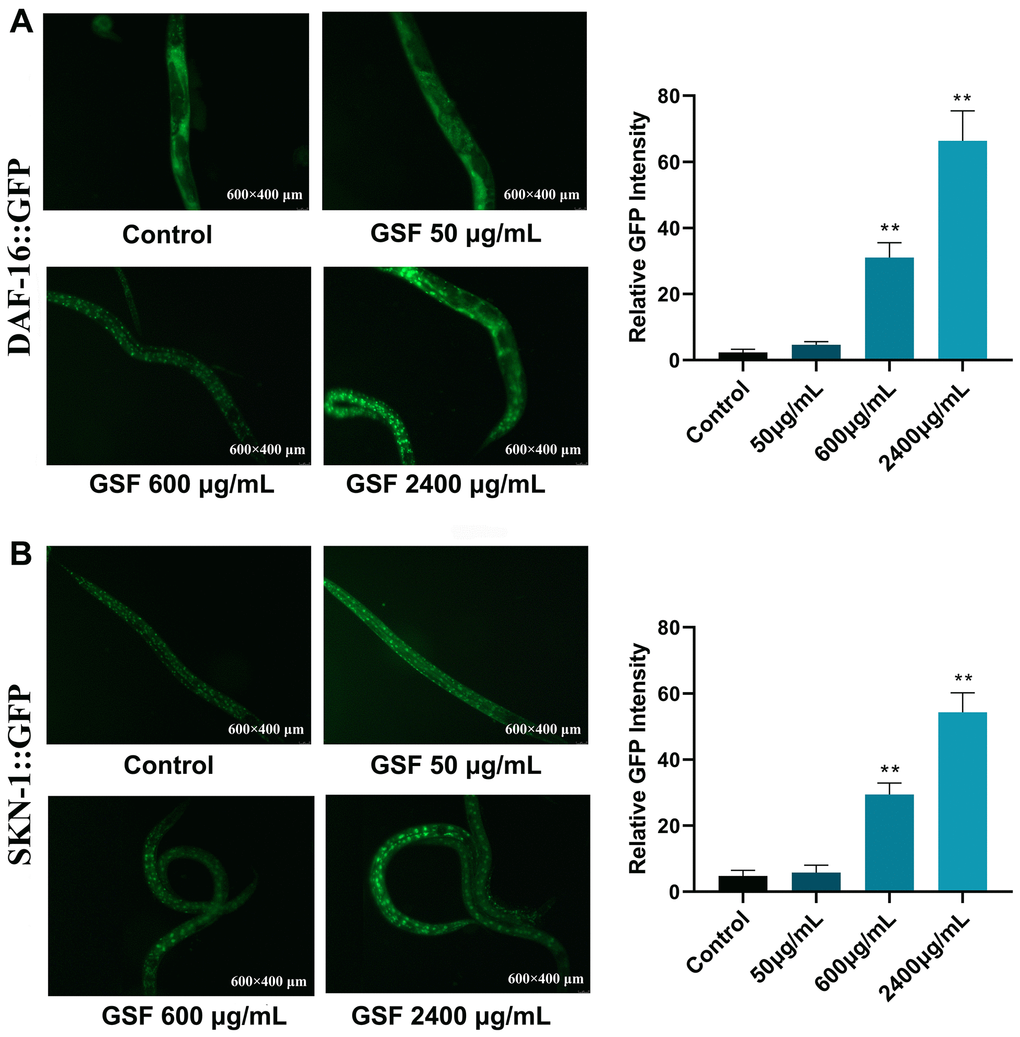 Age-synchronized transgenic nematodes, including theTJ356 strain that contained a DAF-16::GFP reporter gene and the LG333 strain that contained an SKN-1::GFP reporter gene. Synchronized TJ356 nematodes or LG333 nematodes were inoculated into petri dishes (=30 worms per worm) containing control group and GSF groups (50, 600, and 2400 μg/mL). After three days of incubation at 20° C, nematodes were collected and passed through M9 buffer to wash away residual E. coli OP50 from the nematodes. 10 mmol/L levamisole solution was used to anesthetize the nematodes. Subsequently, the GFP fluorescence of GFP-expressing populations was directly observed under a fluorescence microscope. To determine the rate of nuclear translocation, photographs were taken and analyzed using ImageJ software. All the experiments were repeated three times independently.