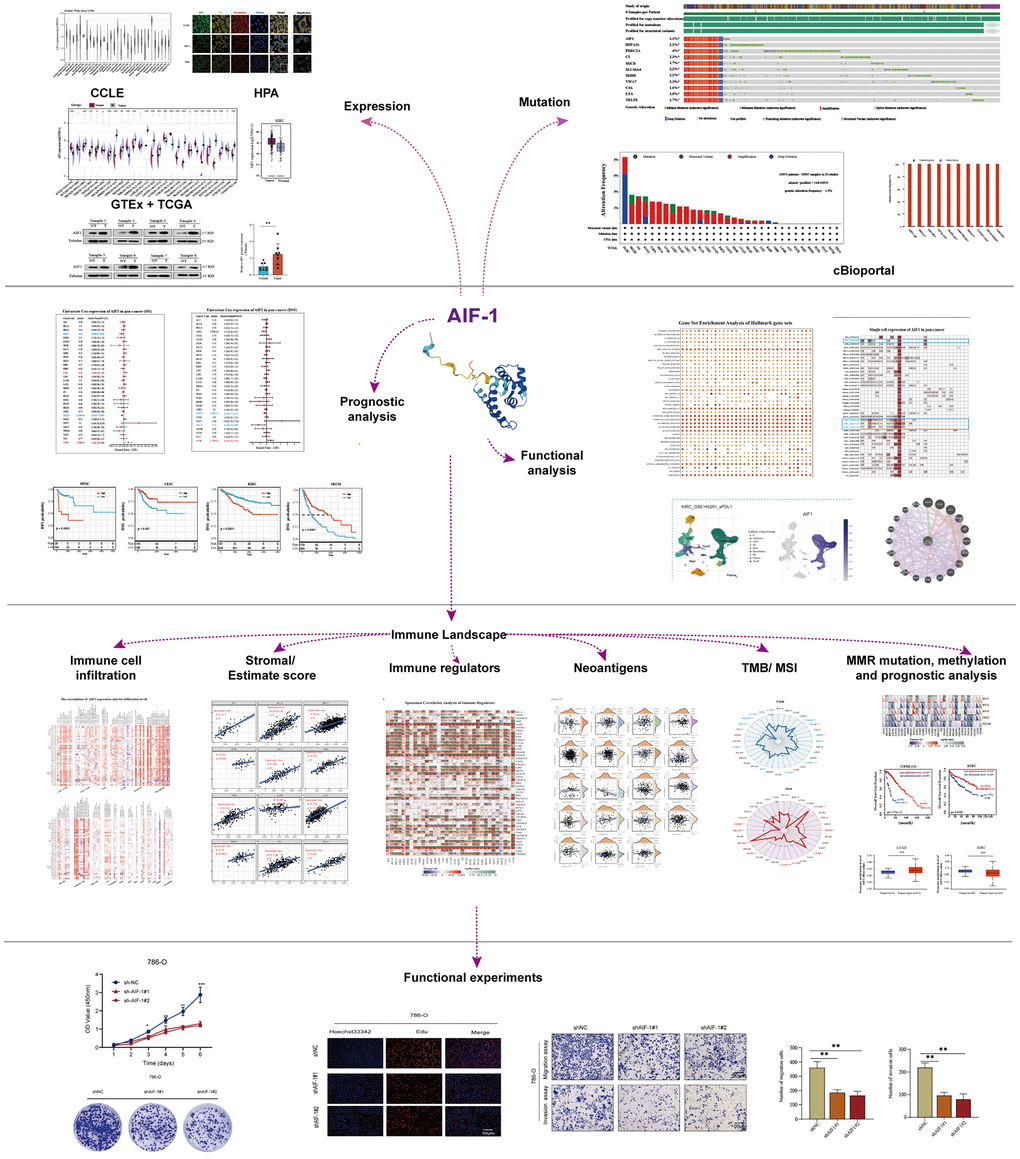 Additionally, we further investigated the correlation between AIF-1 expression and gene mutations, gene modifications, immune cell infiltration, TMB, and MSI in different cancers. Of equal importance, we carried out a series of experiments to investigate the expression of AIF-1 in KIRC tissues and renal cell carcinoma (RCC) cells. Our results indicated that AIF-1 was differentially expressed in these samples. We further demonstrated that AIF-1 exerted a pro-tumorigenic effect in RCC cells.