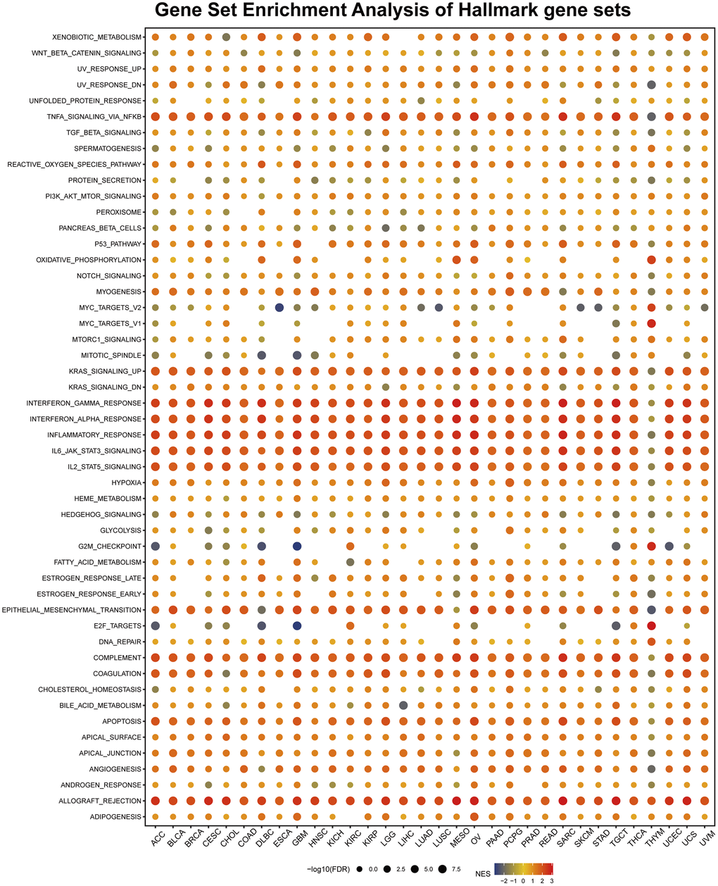 The hallmark gene set, consisting of 50 gene sets, was obtained in the form of a “gmt” file (h.all.v7.4.symbols.gmt) from the Molecular Signatures Database (MSigDB, http://www.gsea-msigdb.org/gsea/index.jsp). We utilized this file to compute the normalized enrichment score (NES) and false discovery rate (FDR) of each biological process for each cancer type. GSEA analysis was performed with the R package “clusterProfiler,” and the findings were presented in a bubble plot generated using the “ggplot2” R package [21].