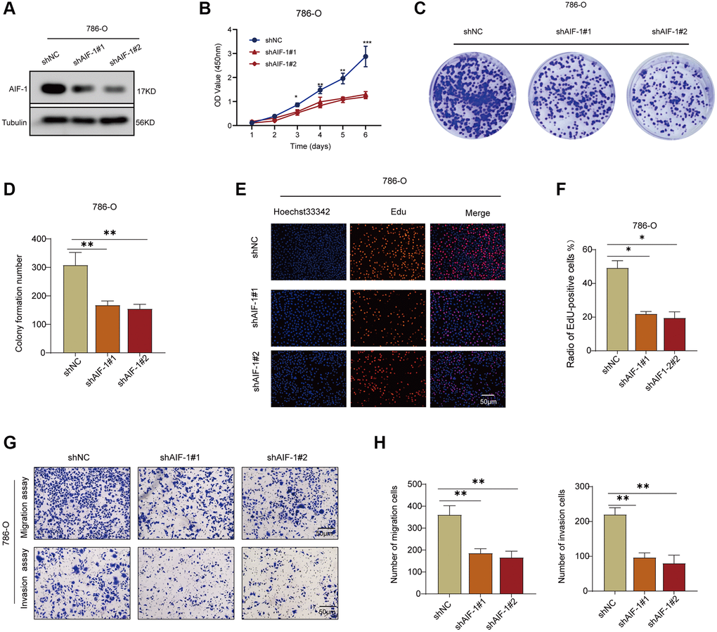Several cultures of 786-O cells were seeded onto 96-well plates at a density of 5.0 × 10^3 cells/well. The CCK-8 reagent (KeyGEN, Shanghai, China) was employed at specific time intervals to evaluate cell viability according to the manufacturer’s methods. Meanwhile, the Cell-Light EdU DNA Cell Proliferation Kit (RiboBio, Guangzhou, China) was used for the EdU assay. The cell proliferation rate of 786-O cells was determined by calculating the ratio of the EdU-positive cells to the total cell count. For the colony formation assay, cells transfected with the shRNA plasmid of AIF-1 were plated in 6-well plates at a density of 500 cells/well and cultured for 2 weeks. Then, the leaves were fixed and stained with 0.5% crystal violet.