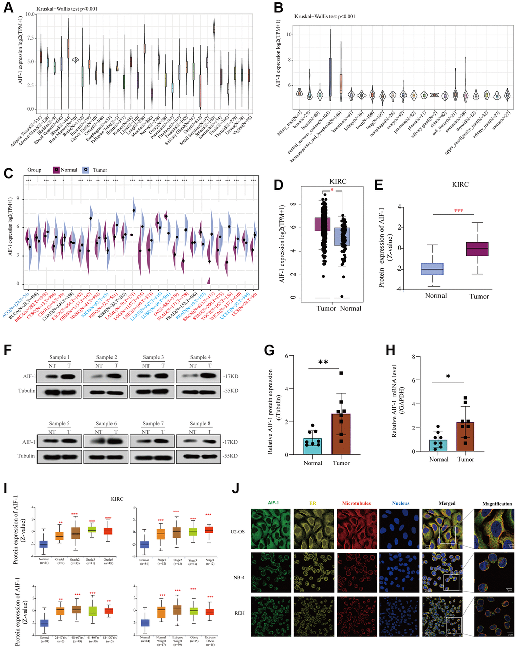 The study incorporated samples from the TCGA database to be further analyzed. Figure 1 illustrates the flow chart of our study design. To examine the expression profile of AIF-1 across multiple tissues and cancer cell lines, we analyzed the mRNA expression levels of AIF-1 in 31 normal human organs (Figure 2A) and 21 cancer cell lines (Figure 2B) by utilizing data retrieved from the GTEx and CCLE datasets. Subsequently, the results showed that AIF-1 was highly expressed in BRCA, CESC, CHOL, ESCA, GBM, HNSC, KIRC, LAML, LGG, LIHC, OV, PAAD, SKCM, STAD, TGCT, THCA, and UCS. In contrast, ACC, KICH, LUAD, LUSC, READ, and UCEC exhibited low expression levels of AIF-1 (Figure 2C). Compared with normal tissues, the mRNA (Figure 2D) and protein (Figure 2E) expression of AIF-1 in KIRC was significantly upregulated. Thus, we further conducted western blot and qRT-PCR assays in clinical KIRC samples. As expected, the findings indicated that AIF-1 expression was significantly elevated in KIRC samples compared with adjacent tissues (Figure 2F–2H). We further assessed AIF-1 expression in cancer stages, pathologic grades, age phases, and body weight. As illustrated in Figure 2I, the AIF-1 expression was significantly increased in stages 1–4 of KIRC patients. We also found that those aged over 20 years old or overweight/obese/extremely obese with KIRC had higher expression levels. Finally, the immunofluorescence experiment presented that the AIF-1 protein was primarily distributed in the endoplasmic reticulum in the U2-OS, NB-4, and REH cell lines (Figure 2J).