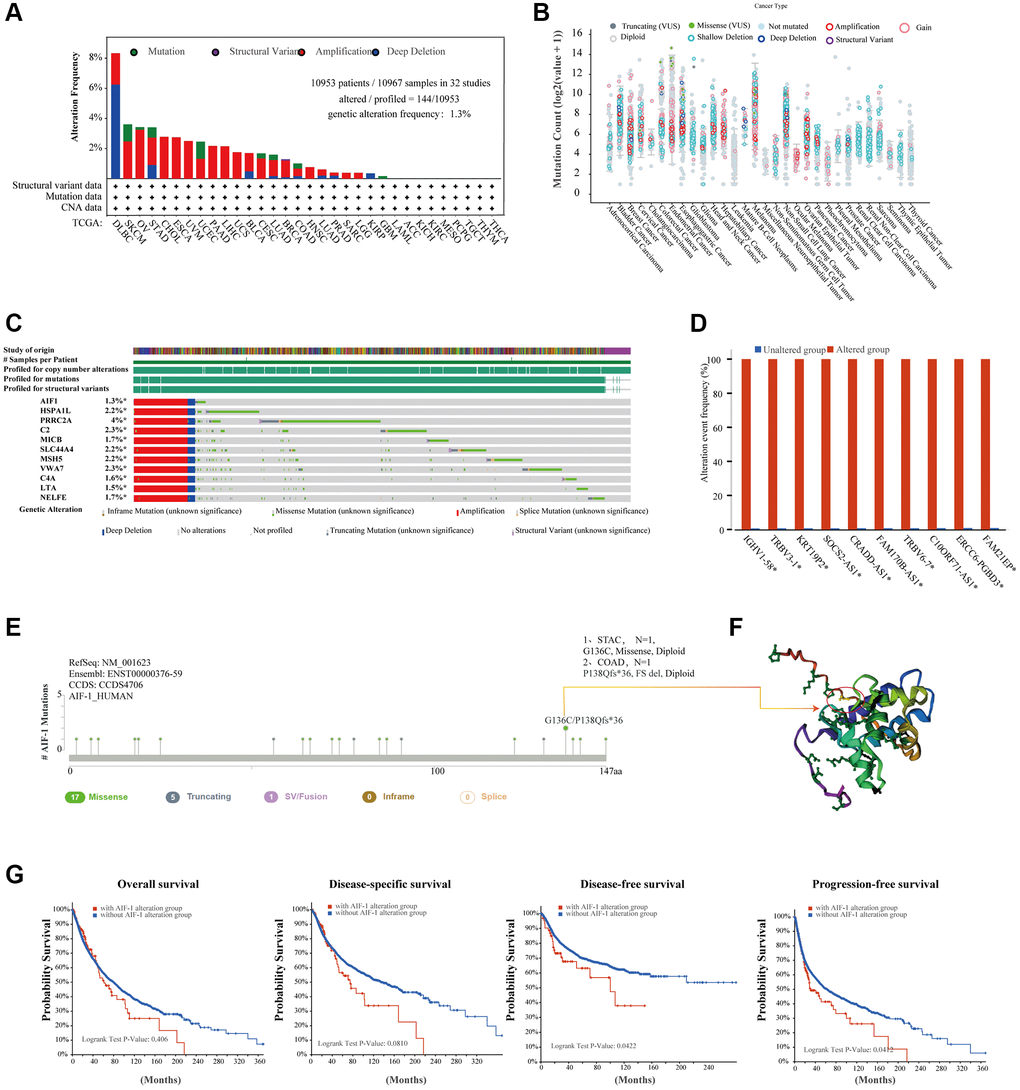 The findings of this study demonstrated that alterations in AIF-1 were not ubiquitous, with the most frequently affected cancer type being lymphoid neoplasm diffuse large B-cell lymphoma (DLBC), with over 8% of DLBC patients exhibiting alterations, mainly in the form of deep deletions. Amplification was the most common type of mutation in most cancers. Given that genetic alterations are a common feature in tumors, alterations observed in the precancerous stages are more likely to be pivotal events that trigger and propel cancer development [24]. However, it is worth noting that cancer progression cannot be attributed to mutations in a single gene. The cooccurrence of mutations in multiple genes is often observed as a typical driver to promote tumor progression and limit treatment response [26, 27]. Accordingly, we analyzed gene expression and alteration cooccurrence to identify potential functional partners of AIF-1 in various cancer types. Intriguingly, we found a remarkable correlation between AIF-1 expression and the expression of HSPA1L, PRRC2A, C2, MICB, SLC44A4, AMSH5, VWA7, C4A, LTA, and NELFE in pan-cancer analysis, which also suggested that they have a certain relationship in the carcinogenic mechanism. Notably, our results indicate that patients without alterations in AIF-1 exhibited improved disease-free and progression-free survival compared to those with AIF-1 alterations. Nevertheless, additional experimental studies will be necessary to comprehensively elucidate the mechanisms by which AIF-1 mutations contribute to tumorigenesis and disease progression.