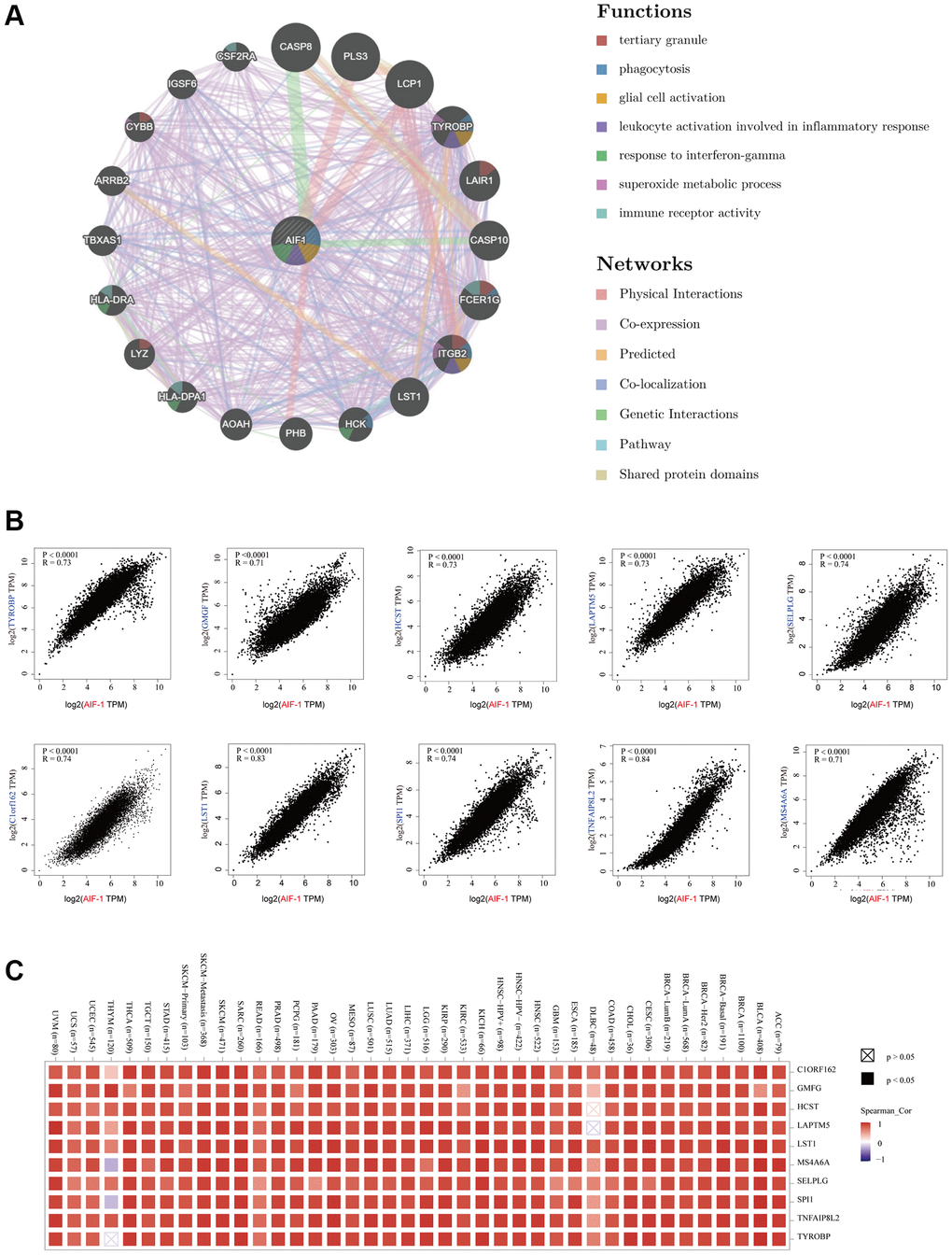 Peptides generated by AIF-1 can bind calcium ions across lymphocytes, macrophages, and monocytes [8]. Therefore, the dysregulated AIF-1 expression has been strongly linked to a range of diseases, including cardiac allograft vasculopathy [9], rheumatoid arthritis [10], hemangioma [11], gastric cancer, glioma [12, 13], malignant breast tumor [14, 15], pancreatic carcinoma [16], and hepatocellular carcinoma [17]. Although the importance of AIF-1, its expression profile, prognostic significance, and functional implications in the majority of cancer types have yet to be systematically investigated. As such, there is a crucial need to take a fresh and comprehensive approach to examine the involvement of AIF-1 across different cancers.