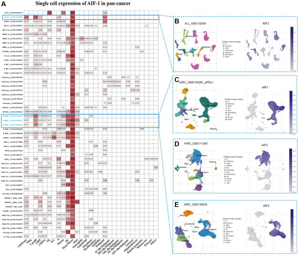The Tumor Immune Single-cell Hub website (TISCH, http://tisch.comp-genomics.org/documentation/) utilized single-cell analysis to examine AIF-1 expression levels in different cell types, using major lineage as cell-type annotation and all cancers as cancer type. The results were presented through a heatmap and scatter diagrams. For more information on the data collection and steps, please refer to the documentation section on the TISCH website [19].