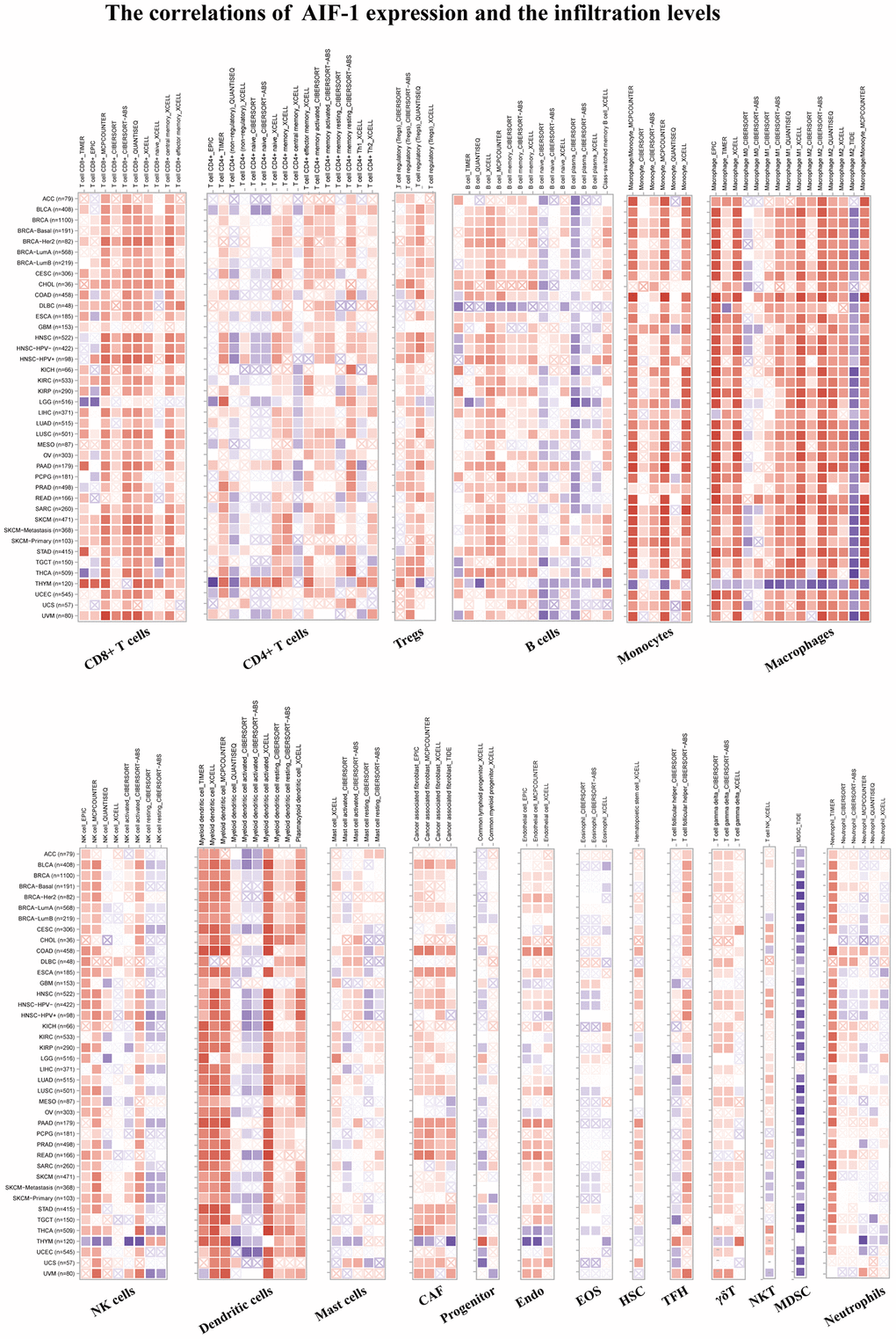 To explore the relationship between AIF-1 expression and immune infiltrates in the pan-cancer, the “Immune-Gene” module of the TIMER2 web server was employed. Specifically, the study analyzed the correlations between AIF-1 mRNA expression and 21 different immune cell subsets, including CD4+ T cells, cancer-associated fibroblasts (CAFs), lymphoid progenitors, myeloid progenitors, monocyte progenitors, endothelial cells (Endos), eosinophils (Eos), hematopoietic stem cells (HSCs), T-cell follicular helper cells, γ/δ T cells, NK T cells, regulatory T cells (Tregs), B cells, neutrophils, monocytes, macrophages, dendritic cells, NK cells, mast cells, and CD8+ T cells. To estimate immune infiltration, various algorithms were employed. The purity-adjusted Spearman’s rank correlation test was used to calculate P and partial correlation (cor) values. The data were represented as a heatmap.