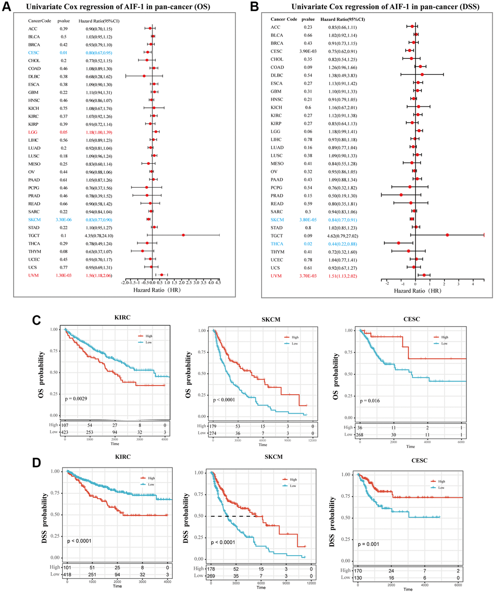 We utilized the Kaplan-Meier method and univariate Cox regression to investigate the predictive potential of AIF-1 in the pan-cancer analysis. The forest plot results (Figure 8A) showed that downregulating AIF-1 had unique relationships with OS time prolongation in LGG (HR = 1.18 [95% CI, 1.00 to 1.39], p = 0.05) and UVM (HR = 1.56 [95% CI, 1.18 to 2.06], p = 0.0013). The overexpression of AIF-1 expression was related to the time delay of OS in CESC (HR = 0.80 [95% CI, 0.67 to 0.95], p = 0.01) and SKCM (HR = 0.83 [95% CI, 0.77 to 0.90], p < 0.0001). In addition, the relationships between AIF-1 expression and DSS in pan-cancer were also investigated. The results revealed a significant HR only in SKCM, THCA, and UVM (Figure 8B). In particular, SKCM had the most potent protective effect (HR = 0.84). Furthermore, the Kaplan–Meier curve analysis of KIRC CESC and SKCM showed that (Figure 8C) higher AIF-1 expression was associated with poor survival outcomes in KIRC and good survival outcomes in SKCM and CESC. Kaplan–Meier curve analysis for DSS in KIRC, CESC, and SKCM achieved consistent results (Figure 8D). The Kaplan-Meier curve analysis revealed that in KIRC, CESC, and SKCM, the expression of AIF-1 was associated with distinct survival outcomes. Specifically, higher expression of AIF-1 was linked to poor survival outcomes in KIRC. In contrast, in CESC and SKCM, higher expression of AIF-1 was associated with favorable survival outcomes. Consistent results were obtained from the Kaplan-Meier analysis of disease-specific survival (DSS) in KIRC, CESC, and SKCM, suggesting that AIF-1 may be a prognostic biomarker for these cancers. Figure 8C provides a visual representation of these findings. To further understand the prophetic role of AIF-1 in SKCM and UVM, univariate and multivariate Cox regression analyses were subsequently used to examine whether AIF-1 is an independent prognostic factor. The multivariate Cox regression analysis showed that AIF-1 was an independent protective factor for SKCM and an independent risk factor for UVM (Supplementary Figure 5).