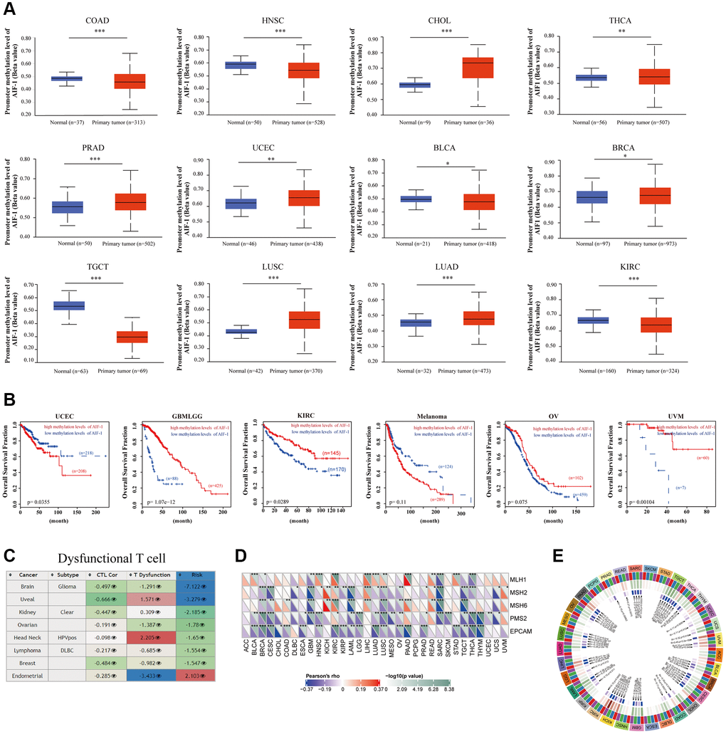 According to the findings, AIF-1 demonstrates hypermethylation in CHOL, THCA, PRAD, UCEC, BRCA, LUSC, and LUAD. However, it exhibits hypomethylation in several other cancer types, such as COAD, HNSC, TGCT, KIRC, and BLCA (Figure 9A). We discovered that hypomethylation of AIF-1 is correlated with shorter survival durations in GBMLGG, KIRC, OV, and UVM. Conversely, hypomethylation of AIF-1 is linked with a favorable prognosis in UCEC and melanoma (Figure 9B). In addition, our findings revealed a correlation between the methylation levels of AIF-1 and dysfunctional T-cell phenotypes in the glioma, uveal, ovarian, head and neck cancer, DLBC, breast cancer, and endometrial cancer cohorts (Figure 9C). Taken together, these results suggest that epigenetic methylation of AIF-1 in cancer patients is connected with dysfunctional T-cell phenotypes through various mechanisms, leading to distinct prognoses. Following our analysis of the association between AIF-1 methylation and prognosis, we investigated the relationship between AIF-1 expression and tumorigenesis mechanisms, specifically MMR defects and DNA methylation of crucial tumorigenesis genes. Our results revealed that AIF-1 was significantly correlated with the five MMR genes in pan-cancer (Figure 9D). Remarkably, most cancer types exhibited a negative correlation with these MMR genes, which could imply a potential role of MMR regulation in tumorigenesis. Additionally, we examined the expression of four methyltransferase genes (DNMT 1, 2, 3A, and 3B) in various cancer types and investigated their relationship with AIF-1. Our findings demonstrated coexpression between AIF-1 and these methyltransferase genes in almost all cancer types except for SKCM, PCPG, MESO, ESCA, DLBC, and ACC. The correlation coefficient was highest in TGCT, CESC, and KICH (Figure 9E).