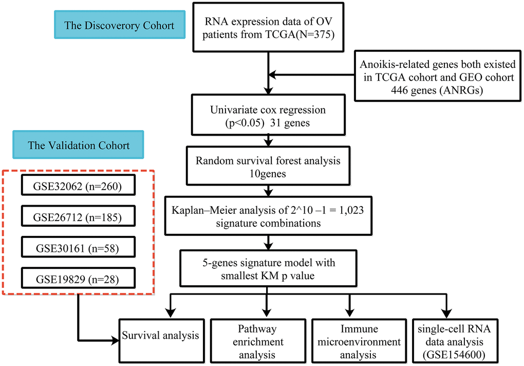 The cohort design and analysis ideas for the entire study were shown in Figure 1. A total of 375 OC patients from the TCGA and 531 OC patients from the GEO were included in this study.