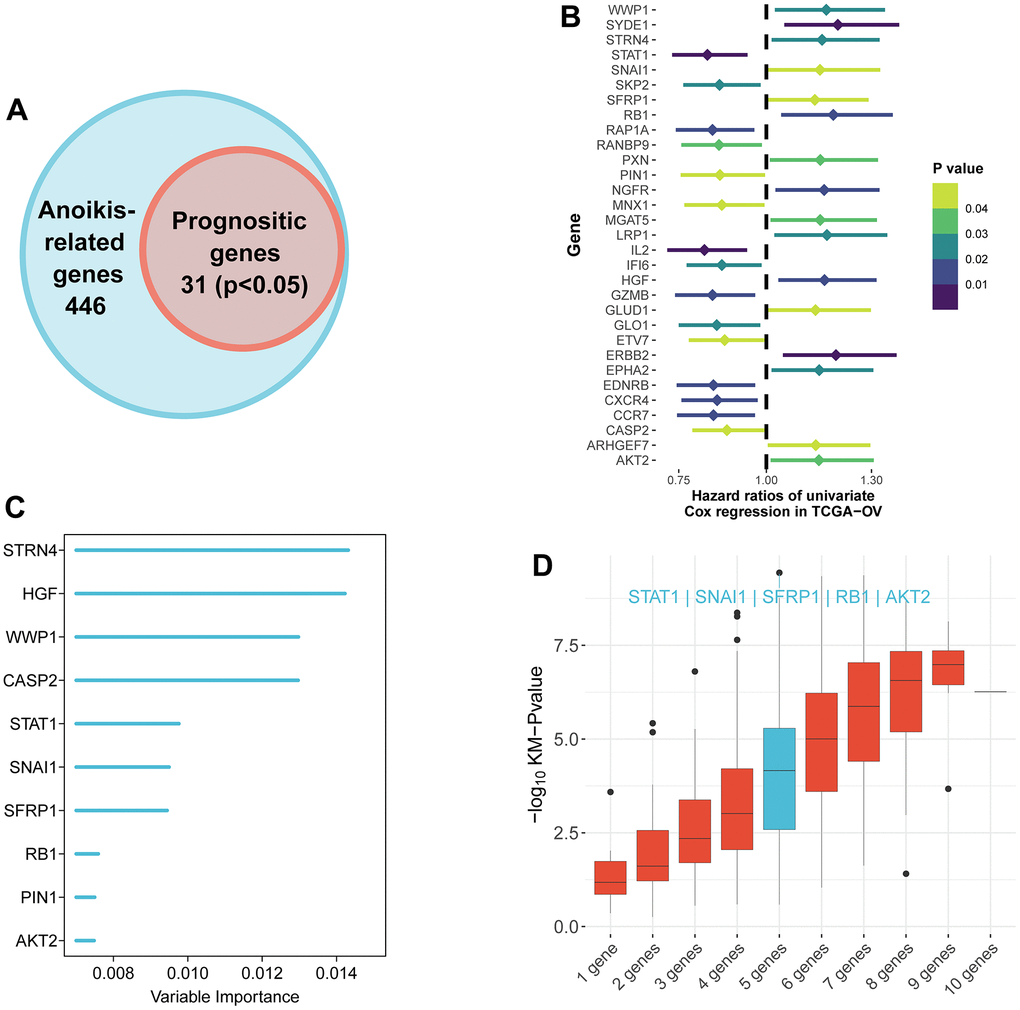 Recent studies have shown that apoptosis plays an important role in the malignant progression of tumors, including breast cancer [13], lung cancer [14], pancreatic cancer [10], gastric carcinoma [15], endometrial cancer [16] and ovarian cancer [17]. OC cells were mainly exposed to TGF- β1 to stimulate SOX2 and inhibit anoikis. Transforming growth factor-β (TGF-β) can also regulate epithelial to stromal transition (EMT) through SMAD3, which is related to anoikis resistance [17]. Platelets promote cancer cell proliferation and EMT, inhibit anoikis, enhance cancer cell extravasation, and promote immune escape of tumor cells in circulation [18]. Hypoxia in the tumor environment may drive the activation of the p38-Hur-SOD2 axis, resulting in a decrease in the sensitivity of the tumor to anoikis [19]. The above studies have shown that apoptosis was associated with tumorigenesis and metastasis of OC. In spite of this, few reports have focus on the prognostic value of the ANRGs for OC patients from the perspective of bioinformatics.