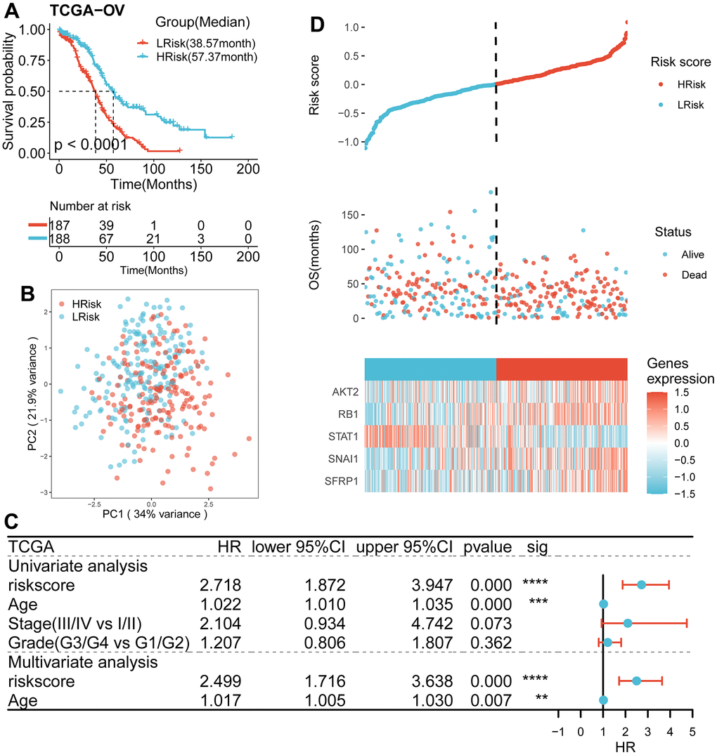 The prognostic value of the signature was evaluated by performing KM analysis, Cox regression analysis and nomogram construction. The “Survival” R package was employed for KM analysis to all cohorts, while the “stats” R package was used for principal component analysis (PCA) between HRisk and LRisk groups in the TCGA cohort. Furthermore, multivariate Cox regression was carried out to test its independently predictive power in all cohorts. Finally, a predictive nomogram was constructed by incorporating the independent predictive factors identified in the TCGA cohort. Its predictive capacity was then investigated by decision curve analysis (DCA) and corresponding calibration analysis.