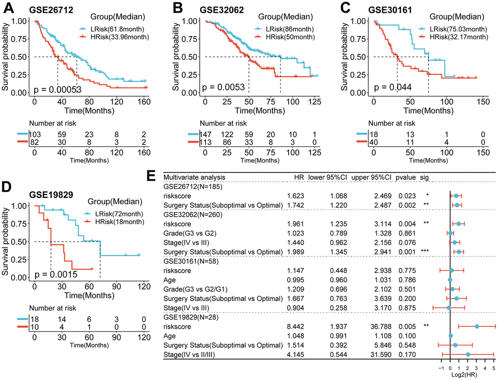 Using the same formula and best cut-off value, the predictive capacity of the prognostic model was verified in four GEO cohorts. Statistically significant worse prognosis was detected among high-risk patients compared to low-risk patients in the GSE26712 (Figure 4A, p<0.001), GSE32062 (Figure 4B, p=0.005), GSE30161 (Figure 4C, p=0.044), GSE19829 (D, p=001) cohort (Log-rank test).