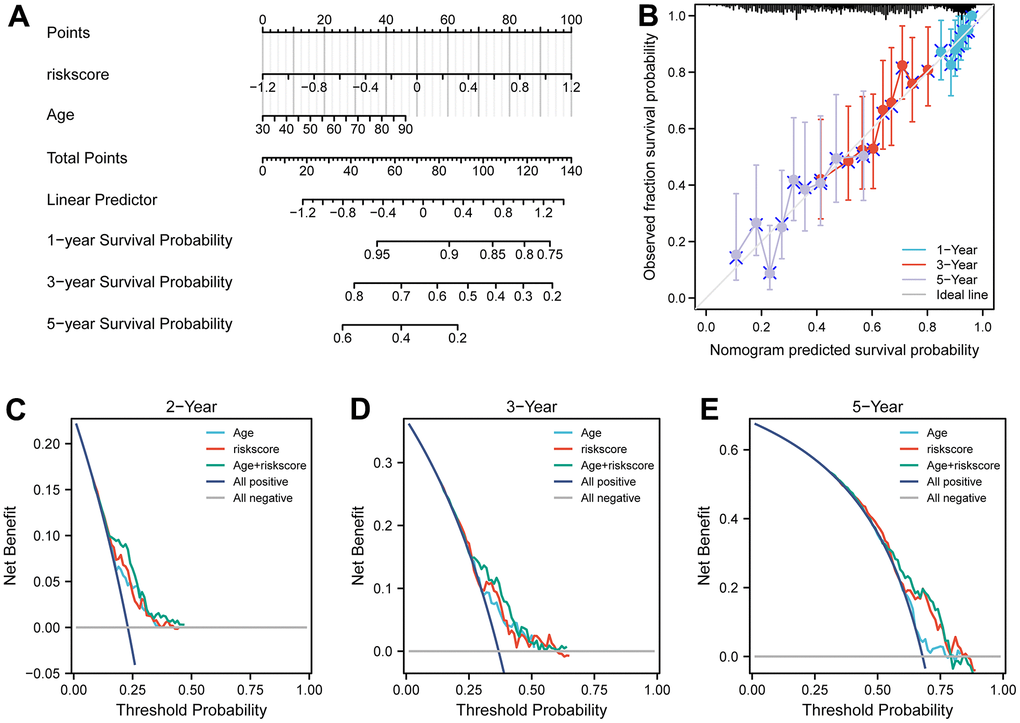 To examine the independence of the signature, univariate and multivariate Cox analyses were implemented in both cohorts. In the discovery cohort, age and risk score were verified to be independent prognostic indicators (Figure 3C). The same result was found in the validation cohorts except GSE30161, where multivariate Cox analysis revealed that risk score was also an independent factor (Figure 4E). Furthermore, surgery status was also determined to be an independent risk factor in the GSE26712 and GSE32062 cohorts. Furthermore, a predictive nomogram based on age and risk score was established using TCGA data (Figure 5A). The accuracy of this model was judged by the calibration curves between predicted and observed 1-year, 3-year, and 5-year outcomes (Figure 5B). DCA analysis also further highlighted its superior predictive performance (Figure 5C–5E).
