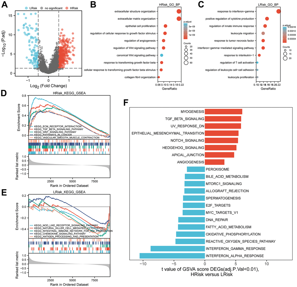 Using the “limma” package for R, we performed differential expression analysis between HRisk and LRisk subgroups. Genes with absolute log2 fold-change > 0.5 and false discovery rate (FDR) < 0.05 were identified as differentially expressed genes (DEGs). Subsequently, DEGs were annotated by enrichment analysis of Gene Ontology biological process (GO-BP) using R package “clusterProfiler” [25]. FDR < 0.05 was established as statistically significant. With the same R package, Gene Set Enrichment Analysis (GSEA) analysis of Kyoto Encyclopedia of Genes and Genomes (KEGG) pathways was performed, wherein FDR < 0.25 was determined to be statistically significant. To assign activity estimates of 50 HALLMARK pathways to each tumor sample, the “GSVA” R package [26] was used to quantify scores, followed by differential analysis through the “limma” R package.