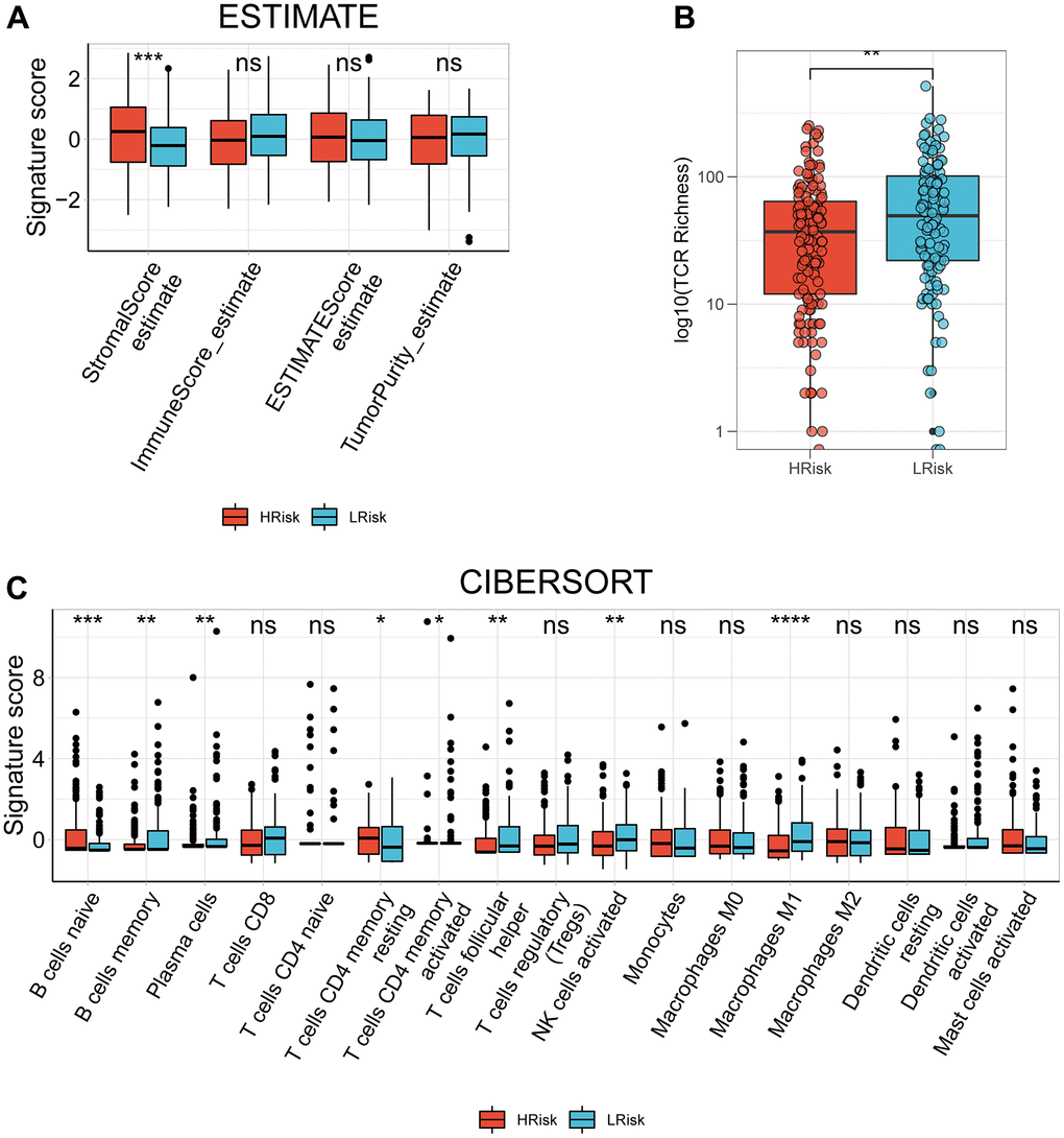 Compared with LRisk patients, HRisk patients got a significantly higher stromal score (Figure 7A). Although the p-value was not meaningful, LRisk patients got a higher immune score. Moreover, the TCR richness was found to be significantly higher in the LRisk subgroup (Figure 7B), accompanied by higher abundances of B cells memory, plasma cells, T cells CD4 memory activated, T cells follicular helper, NK cells activated and Macrophages M1 in this group as compared to the HRisk patients (Figure 7C). On the contrary, HRisk patients exhibited a higher abundance of B cells naïve and T cells CD4 memory resting (Figure 7C).