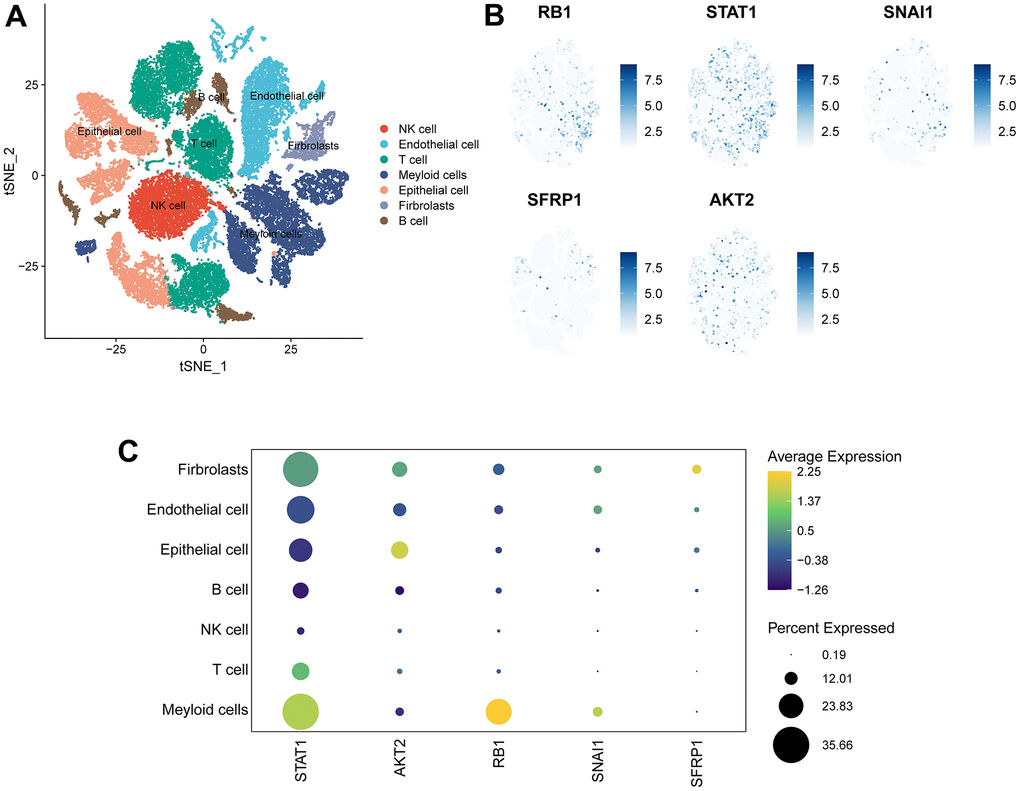 The scRNA-seq dataset (GES154600) was used to investigate the specific expression of five signature genes in variable TME-associated cells. In the downstream analysis, 7 cell types were annotated in OC TME (Figure 8A). Notably, STAT1 was expressed at high levels in variable cell types, with fibroblasts and myeloid cells exhibiting particularly elevated expression. AKT2 was mainly expressed in malignant epithelial cells and fibroblasts. Expression of SNAI1 and RB1 was generally low with the exception of their transcription in myeloid cells. Lastly, SFRP1 was almost exclusively expressed in fibroblasts (Figure 8B, 8C).