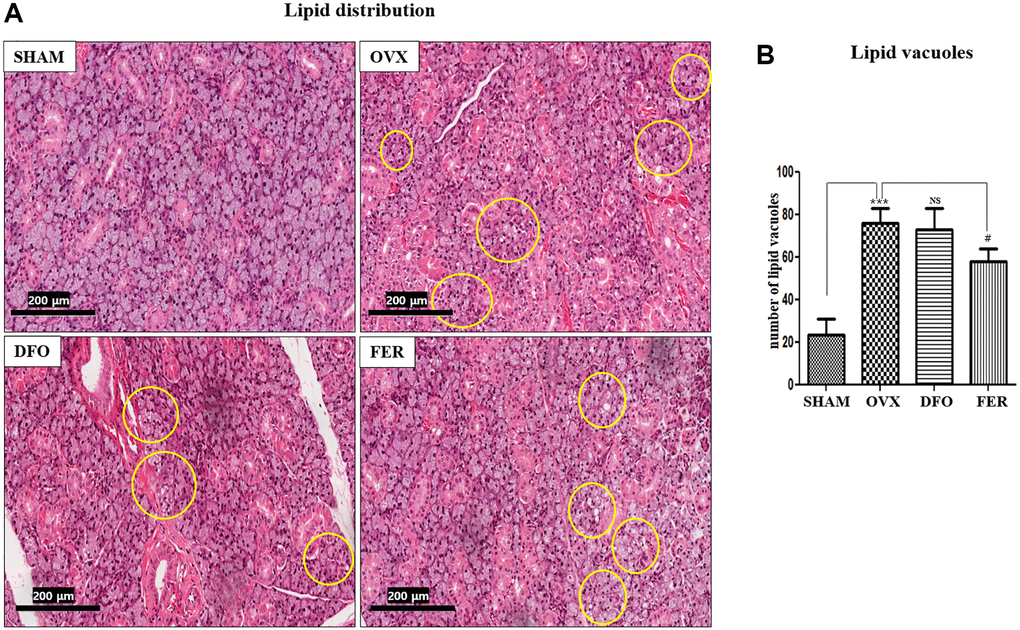 Lipid deposition was observed in the submandibular glands. The results showed that the lipid distribution was significantly higher in the OVX group than in the SHAM group (p < 0.001), and the FER group exhibited a decrease compared to the OVX group (p < 0.05) (Figure 2A). The degree of lipid deposition was quantified by counting the number of lipid vacuoles (Figure 2B).