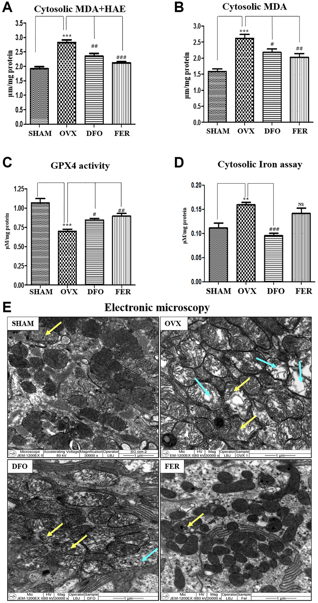 MDA and HAE are lipid peroxidation products and common ferroptosis markers. Compared with the SHAM group, the cytosolic MDA and MDA + HAE concentrations of the submandibular gland increased in the OVX group and decreased in the DFO and FER groups (p < 0.05) (Figure 3A and 3B). GPX4 (glutathione peroxidase 4) activity is important for regulation of the ferroptosis pathway. GPX4 activity was significantly reduced in the OVX group and recovered in the DFO and FER groups (Figure 3C). To assess the iron content, which is a key marker of ferroptosis, we assayed the iron level in the submandibular gland. Compared to the SHAM group, the cytosolic iron level increased in the OVX group (p < 0.01) and was significantly decreased in the DFO group (p < 0.001). There was no difference between the FER group and the OVX group (Figure 3D). We observed the status of mitochondria in the submandibular gland because mitochondria play an important role in oxidative metabolism. In the SHAM group, there was clear condensation of mitochondria and their shape was normal, but in the OVX group, the shape was irregular and the integrity was decreased. In the DFO and FER groups, mitochondrial recovery was confirmed morphologically (Figure 3E).