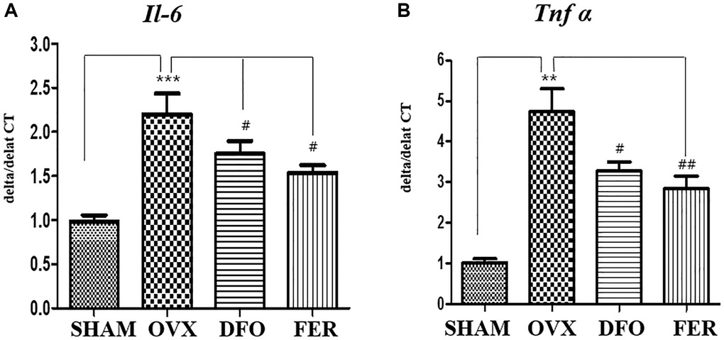 The inhibitory effects of DFO and FER on the secretion of pro-inflammatory cytokines were evaluated. As shown in Figure 4A, the expression level of interleukin 6 (Il-6) mRNA was increased in the OVX group (p < 0.001) and decreased in the DFO (p < 0.05) and FER groups (p < 0.05). In addition, the level of tumor necrosis factor-alpha (Tnf-α) mRNA was also increased in the OVX group (p < 0.01) and decreased in the DFO (p < 0.05) and FER (p < 0.01) groups (Figure 4B). These results indicate that DFO and FER can suppress the increased secretion of pro-inflammatory cytokines by OVX.