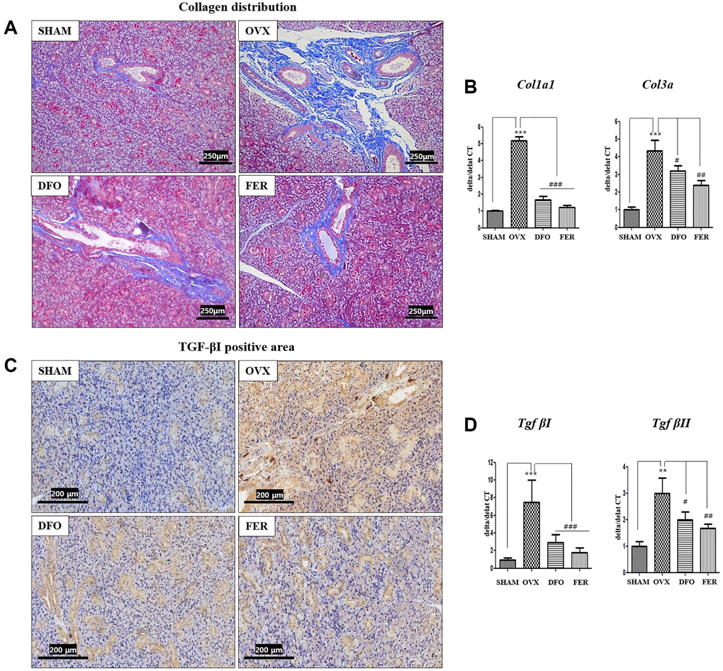Masson’s trichrome staining showed that the degree of fibrosis in the submandibular gland tissue was significantly higher in the OVX group than that in the SHAM group. However, both the DFO and FER groups exhibited significantly decreased fibrosis (Figure 5A). The expression of collagen type I alpha 1 chain (Col1a1) and collagen type III alpha chain (Col3a) mRNAs was also significantly increased in the OVX group and decreased in the DFO and FER groups (Figure 5B). Immunohistochemical analysis showed that the level of TGF-βI was higher in the OVX group and lower in the DFO and FER groups (Figure 5C). The expression of Tgf-βI and Tgf-βII mRNAs also significantly increased in the OVX group and decreased in the DFO and FER groups (Figure 5D).