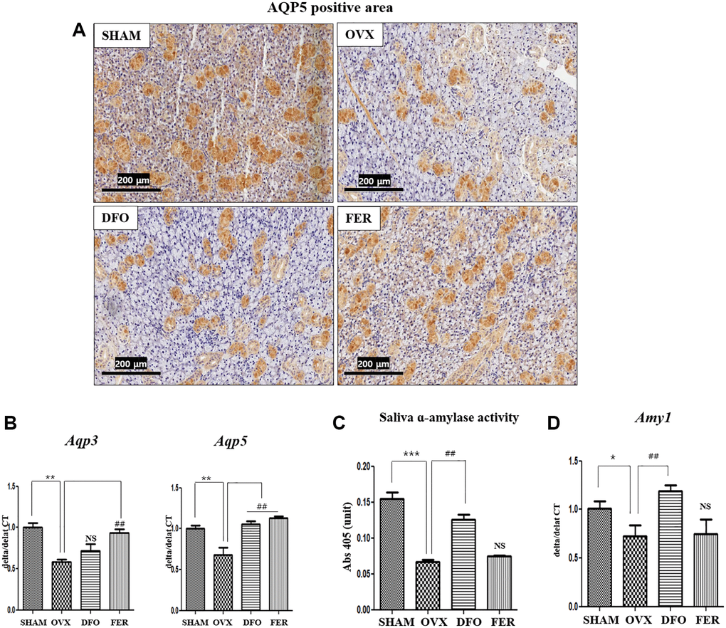 To determine whether ferroptosis inhibitors could improve submandibular gland function, we assayed aquaporin (AQP) and α-amylase levels, as they are important for saliva generation. Immunohistochemical analysis showed that the level of AQP5 decreased in the OVX group and significantly increased in the DFO and FER groups (Figure 6A). Quantitatively, the expression of Aqp3 mRNA was increased in the FER group compared to the OVX group (p < 0.01), but there was no difference with the DFO group. The expression of Aqp5 mRNA was increased in both the DFO and FER (p < 0.01) groups compared to the OVX group (p < 0.01) (Figure 6B). Salivary α-amylase activity decreased in the OVX group (p < 0.001) and increased in the DFO group (p < 0.01) (Figure 6C). Quantitatively, the expression of alpha-amylase 1 (Amy1α) mRNA was decreased in the OVX group (p < 0.05) and increased in the DFO group (p < 0.01) (Figure 6D). These results suggest that the ferroptosis inhibitors can reverse the submandibular gland dysfunction that occurs after menopause.