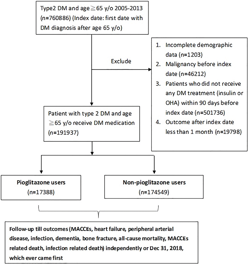 As illustrated in Figure 1, type 2 diabetes patients aged ≥65 years were identified from the NHIRD. The first outpatient visit date indicating a diagnosis of type 2 diabetes, irrespective of newly diagnosed diabetes or chronic diabetes, after 65 years of age was defined as the index date. For example, a patient was diagnosed with diabetes at the age of 62 and had regular outpatient visits afterward. His index date in this study would be the date of first outpatient visit for diabetes after age 65. Patients were excluded from this study if they had the following conditions: (1) incomplete demographic data, (2) diagnosis of malignancy before the index date, (3) did not receive any OHA or insulin treatment within 3 months preceding the index date, and (4) outcomes within 1 month after the index date. The remaining patients were further divided into two groups, namely pioglitazone and non-pioglitazone groups, depending on whether they used pioglitazone within 3 months preceding the index date.