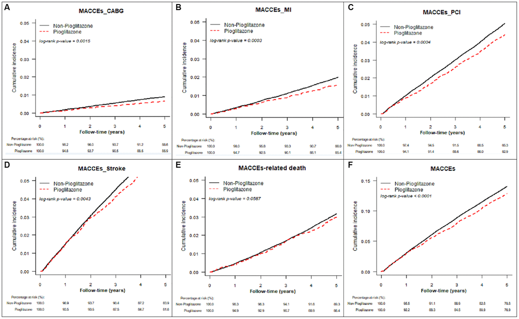 Table 2 represents the study outcomes after a 5-year follow-up, after PSSWs, the pioglitazone group exhibited a lower rate (per person-years) of MACCE (2.76% vs. 3.03%, hazard ratio [HR]: 0.91, 95% confidence interval [CI]: 0.87–0.95), acute myocardial infarction (0.37% vs. 0.46%, HR:0.79, 95% CI: 0.70–0.90), stroke (1.56% vs. 1.72%, HR:0.91, 95% CI: 0.86–0.97), and new-diagnosis dementia (1.32% vs. 1.46%, HR:0.91, 95% CI: 0.84–0.98) compared to the non-pioglitazone group. For coronary revascularisations, the pioglitazone group exhibited a lower rate of coronary artery bypass graft (0.16% vs. 0.21%, HR: 0.72, 95% CI: 0.59–0.88) and percutaneous coronary intervention (1.03% vs. 1.17%, HR: 0.87, 95% CI: 0.81–0.94) compared to non-pioglitazone group. However, the pioglitazone group exhibited a higher rate of new-diagnosis non-traffic-accident bone fractures (5.37% vs. 4.47%, HR: 1.24, 95% CI: 1.19–1.28). The cumulative incidence curves for study outcomes are shown in Figure 2 (varied major advanced cardiac and cardiovascular events after PSSW) and Figure 3 (other study outcomes after PSSW).