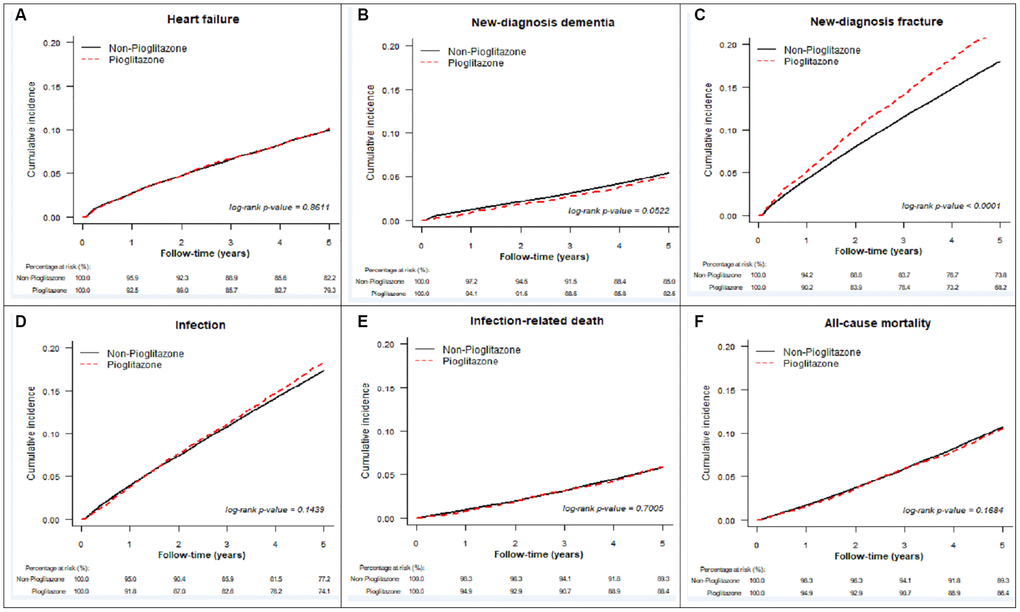 The clinical outcomes in this study were major adverse cardiac and cerebrovascular events (MACCE) (a composite of myocardial infarction (MI), cardiogenic shock, new-diagnosis heart failure, coronary revascularization, malignant arrhythmia, and cerebrovascular events), infection, new- diagnosis dementia (all kinds included), new- diagnosis non-traffic accident bone fracture, new- diagnosis heart failure, all-cause mortality, MACCE-related mortality, and infection-related mortality. MACCE and infection were identified according to the principal diagnosis at inpatient, outpatient, or emergency room visits. New-diagnosis dementia, new-diagnosis non-traffic accident bone fracture, and new-diagnosis heart failure were identified according to the first three diagnoses at hospitalization, emergency room, or outpatient visits. In previous NHIRD validation researches, the positive predictive values for acute myocardial infarction [19], ischemic stroke [20], and CV death [21] were 88%, 88–94%, and 95%, respectively. Because dementia and heart failure are chronic diseases and the diagnosis of bone fracture may be long-term used during outpatient visits for subsequent treatment, those who have already been diagnosed with dementia, heart failure, and bone fracture before the index date would not be counted in the outcomes of new-diagnosis heart failure, new-diagnosis dementia, and new-diagnosis bone fracture. All-cause mortality was determined based on the patient’s appearance in the Taiwan Death Registry. The reason for death was determined using either the principal diagnosis in discharge records for inpatient hospital deaths or, according to the Taiwan Death Registry for outpatient deaths. The infection-related death was identified if the principal discharge diagnosis for death was infection (ICD-9-CM and ICD-10-CM codes for infection were listed in Supplementary Table 1). Because the treatment of diabetes may change from time to time and an observational study cannot guarantee an extended treatment duration of pioglitazone, this study thus only compared outcomes within five years. The follow-up time was from the index date to the first occurrence of any study outcome independently or until five years after the index date, whichever occurred first.
