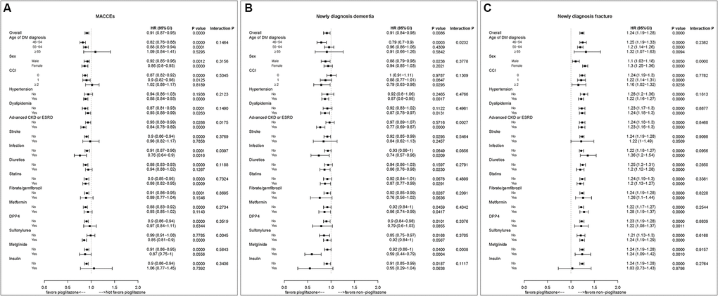 To determine whether the benefits or risks of pioglitazone were maintained under different conditions, we performed subgroup analyses for MACCE, dementia, and bone fractures (Figure 4). Regarding MACCE, the benefit of pioglitazone seemed to be more pronounced in patients with comorbid chronic kidney disease. Regarding new-diagnosis dementia, the benefit of pioglitazone seems to be more apparent in patients with comorbid chronic kidney disease. Lastly, regarding new-onset bone fractures, the risk of pioglitazone seems to be higher in women.