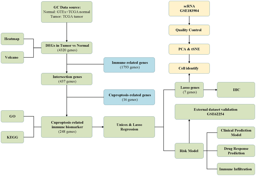 Raw data of gene transcriptome profiles of gastric cancer and normal gastric specimens were collected from TCGA, GTEx, and GEO database. The data from TCGA (414 GC specimens and 36 normal gastric specimens) and GTEx (174 normal gastric specimens) were acquired from UCSC Xena [42], a genetic data analysis platform, standardized and then combined for the representational difference analysis (RDA). Acquisition of cuproptosis-related genes was from the first published literature on cell cuproptosis [9]. The immune-related genes (IRGs) used for this study were extracted from the ImmPort database [29]. Moreover, the prognostic accuracy of the cuproptosis-related immune biomarker signature was verified by GSE62254 containing 300 GC samples and the corresponding clinical and prognostic information [43].