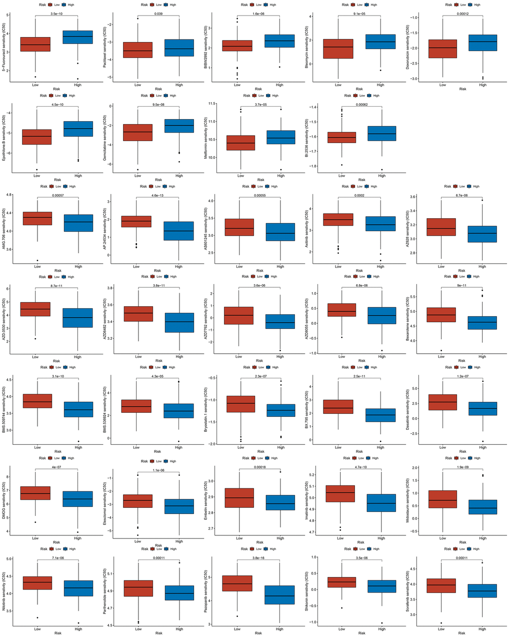 The analytical package (pRRophetic) [48] was applied to the Genomics of Drug Sensitivity in Cancer database (GDSC) to predict the response to chemotherapeutic drugs to investigate the differences in sensitivity towards them between the two groups.