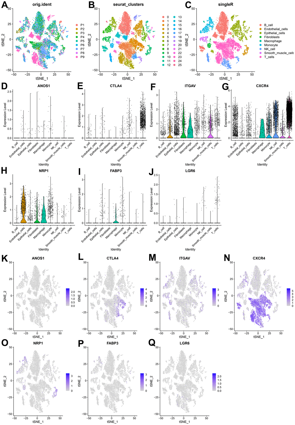 We extracted and analyzed nine specimens of GC scRNA-seq from the GSE183904 dataset, and performed quality control of the data. 20859 cells were obtained after filtering the cells with mitochondrial gene content > 25 %, the nFeature RNA < 100, and nFeature RNA > 5000 criterions. The quality control indicators such as the number of genes, unique molecular identifiers (UMI), and mitochondrial gene ratio before and after quality control were displayed (Supplementary Figure 3A–3K). 3,000 variable features of the dataset are detected using the ‘vst’ method by employing the ‘FindVariableFeatures’ function, dimensioned and visualized using PCA analysis (Supplementary Figure 3L). By selecting the first 35 principal components as the statistically significant input of t-SNE (Supplementary Figure 3M), the cells were classified into 25 independent clusters (Figure 11A, 11B). SingleR was used to identify the cell clusters as 9 cell types: B cells, endothelial cells, epithelial cells, fibroblasts, macrophage, monocyte, NK cells, smooth muscle cells, and T cells (Figure 11C). We investigated the expression of seven CRIGs (ANOS1, CTLA4, ITGAV, CXCR4, NRP1, FABP3, and LGR6) at the single cell level of GC (Figure 11D–11Q). The data revealed that CTLA4 was only enriched in T cells. ITGAV was significantly enriched in endothelial cells, epithelial cells, fibroblasts, and macrophage cells. CXCR4 was widely enriched in B cells, macrophages, monocytes, NK cells, and T cells. NRP1 was detected to be dramatically enriched in endothelial cells, fibroblasts, and macrophages. The abovementioned results indicated that CRIGs in the specific cell types played key roles in the GC progression.