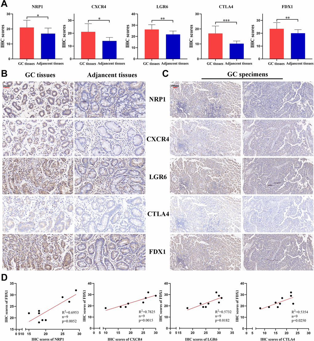 The detailed procedures followed for IHC were consistent with the previous descriptions [52, 53]. The information of primary antibodies is listed as follows: CTLA4 (Cell Signaling Technology, 53560S), CXCR4 (Proteintech, 60042-1-Ig), NRP1 (Proteintech, 60067-1-Ig), LGR6 (Proteintech, 17658-1-AP), and FDX1 (Proteintech, 12592-1-AP). The use and dilution ratio of primary antibodies were in accordance with the manufacturers’ instructions. Five fields were randomly selected under the 40× objective lens. The IHC scores of the samples were calculated as the sum of the scores obtained for five fields. The staining intensities and positive percentages were included in the IHC scores. The degree of staining was rated as 0, 1, 2, and 3 points, corresponding to undetected, mildly stained, moderately stained, and strongly stained, respectively. Likewise, the percentage of positivity was divided into < 5 %, from 5 % to 25 %, from 26 % to 50 %, from 51 % to 75 %, and > 75 % of positively stained cells corresponding to 0, 1, 2, 3, and 4, respectively.