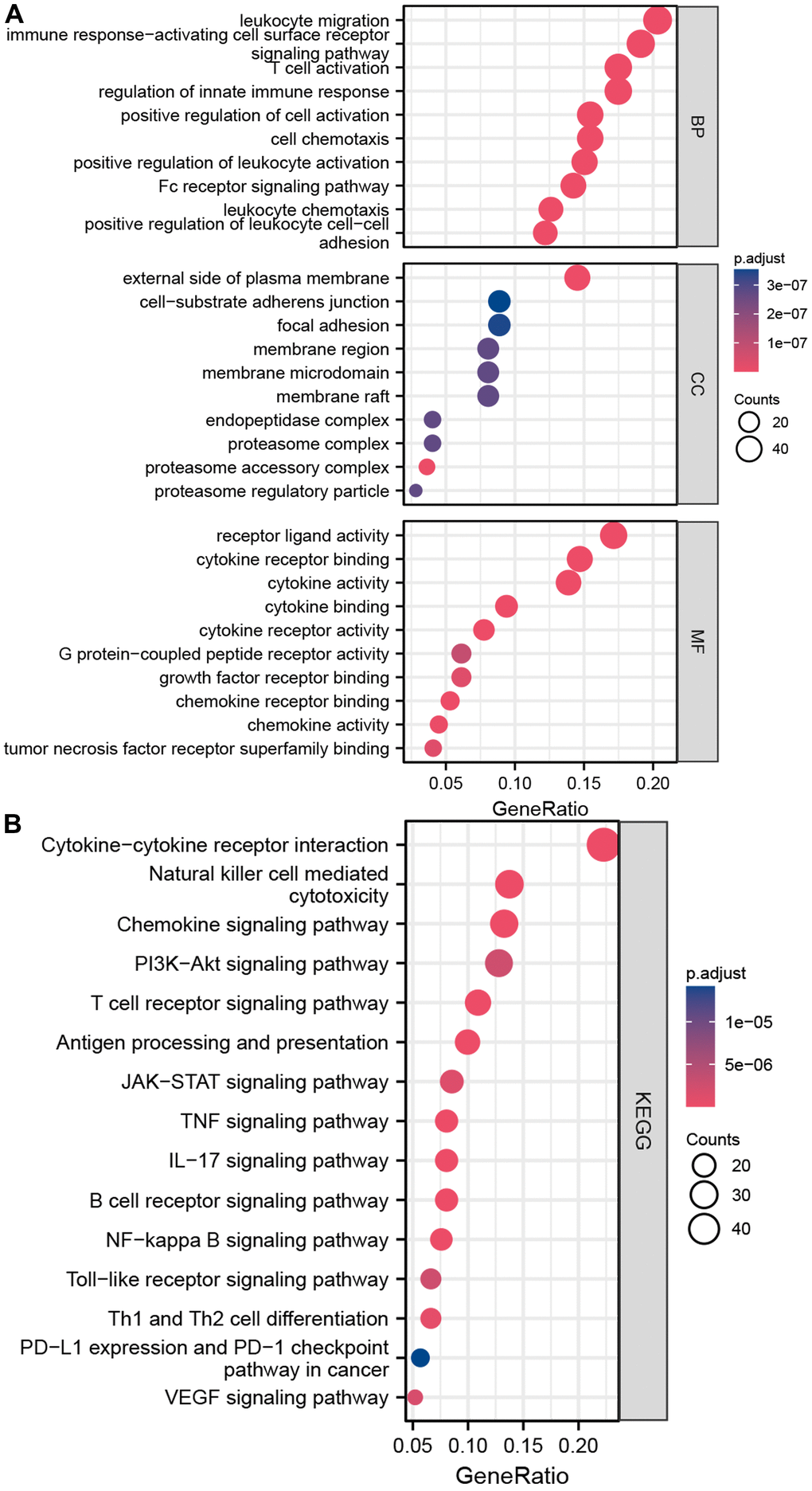 The schematic in Figure 1 shows the fundamental analysis flow of this research. A comprehensive and integrated analysis of the dysregulated genes in normal and GC tissues was performed to identify gene sets that have prognostic values for GC patients. This study’s data for normal tissues has two sources: the profiles of normal gastric mucosa obtained from the GTEx database and the profiles of paired adjacent tissues of tumors extracted from the TCGA database. The profiles of all the GC tissues were acquired from TCGA database. As shown in Figure 2A, the heatmap depicts the DEGs between normal and GC tissues. PCA revealed intrinsic differences in principal components between normal and GC samples (Figure 2B). Our findings confirmed the heterogeneity of tissue components between GC and normal gastric mucosa. The immune-related genes (IRGs) were extracted from the ImmPort database [29]. We found 437 IRGs (379 upregulated IRGs and 58 downregulated IRGs) that were significantly differentially expressed between normal and GC tissues (Figure 2C). We also identified 16 cuproptosis-related genes obtained from top published literature [9]. To investigate the potential correlation between IRGs and cuproptosis-related genes, the criteria of |cor| >0.2 and p<0.05 were set, which revealed 222 IRGs to be positively related to the cuproptosis, while 26 were negatively related (Figure 2D). We then explored the potential functions of differently expressed CRIGs by GO and KEGG analyses, wherein biological process analysis revealed that CRIGs are mainly involved in biological functions and signal transduction of immune cells. Cellular component analysis revealed that CRIGs are mainly located on the cell-substrate adherens junction, focal adhesion, and membrane region and external side of the plasma membrane (Figure 3A). Molecular function analysis found that CRIGs primarily participated in receptor-ligand activity, cytokine receptor binding, cytokine activity, and cytokine binding. The data of KEGG enrichment analysis showed the CRIGs to be mostly enriched in PI3K-Akt and other pathways to regulate tumor progression (Figure 3B). We preliminarily explored the decisive roles of CRIGs in GC through the abovementioned methods.