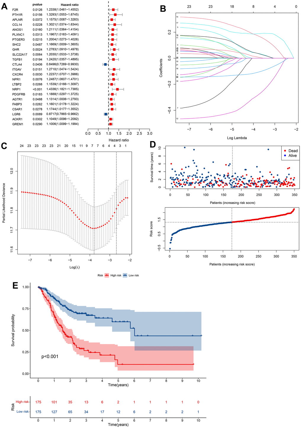 Univariate Cox regression analysis and least absolute shrinkage and selection operator (LASSO) Cox regression analysis were used to optimize and construct the prognostic risk signature of CRIGs. The calculation formula of risk score is: risk score =