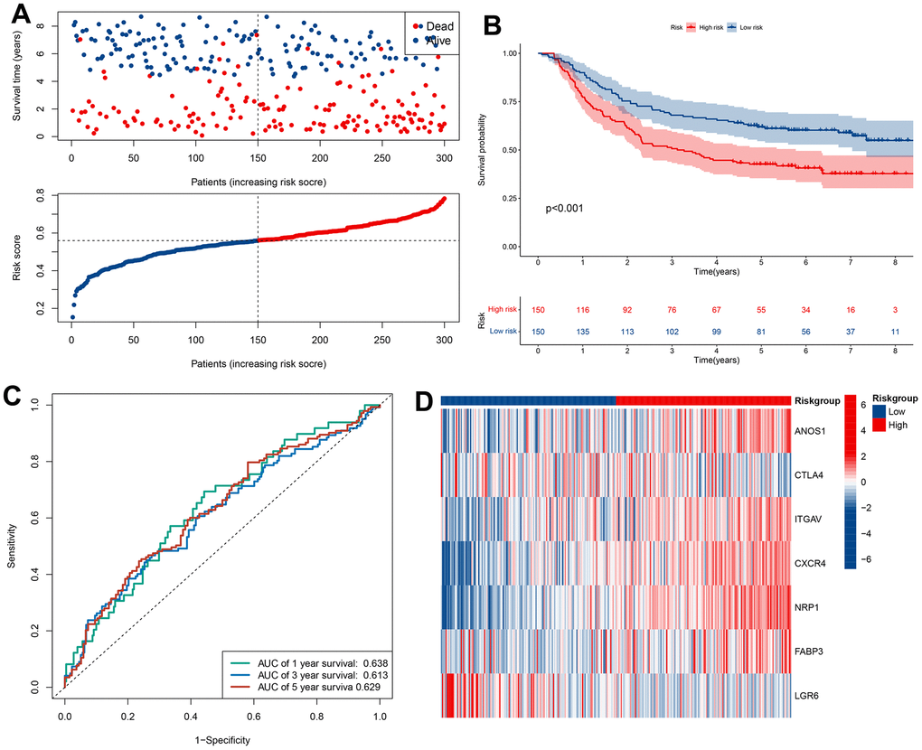 Gastric cancer (GC) is one of the most frequent malignant tumors worldwide, with its morbidity and cancer-related mortality ranking fifth and fourth worldwide, respectively [1]. New GC cases in China accounted for 44.1 % of the global new cases yearly. At the same time, GC-associated deaths accounted for more than 50 % of the total global deaths of GC. Such phenomena severely endangered people’s health, subjecting patients to significant economic and mental burdens [2]. Currently, tumor-node-metastasis (TNM) staging of postoperative specimens is a widely used clinical tool to forecast the long-term survival time of GC patients. However, studies have revealed that TNM staging still has significant limitations in clinical application [3]. Abundant studies have proved the efficiency of multi-gene signatures in distinguishing different cancer recurrence risks and improving the prognostic accuracy of patients [4–7]. Hence, it is essential to construct a potent signature for forecasting long-term prognosis and stratifying risk of GC patients to guide the precise treatment of individuals as a solution to a significant problem in GC.