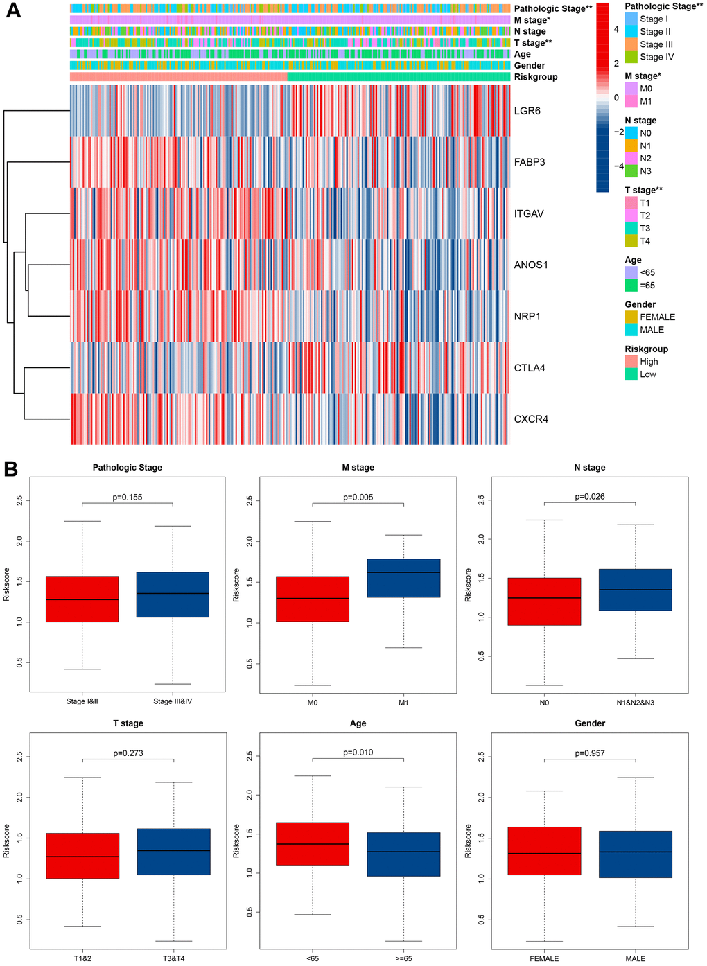 We assessed the relationship between the cuproptosis-related immune biomarker signature and pathological characteristics in GC patients using chi-square test (Figure 7A). Our analysis revealed that the T, N, M, and pathological stages were more malignant in the GC patients with high risk scores. Additionally, the risk scores for the M1 stage, N1 and N2 and N3 stage, and age groups under 65 years were higher than those for the M0 stage, N0 stage, and age groups over 65. In contrast, the risk scores of the different pathological stages, T stage, and gender in GC patients were no significance (Figure 7B). These findings suggested that the prognostic model not only accurately predicted GC patients’ prognosis but may also indicated their clinicopathological characteristics. Stratification analysis further investigated the efficiency of the signature in subgroups, revealing that age >= 65, age < 65, female, male, M1 stage, M0 stage, N0 stage, N1 and N2 and N3 stage, Stage I-II, Stage III-IV, T1-T2 stage, and T3-T4 stage, GC patients with high risk scores often owned a poor long-term survival (Supplementary Figure 1).