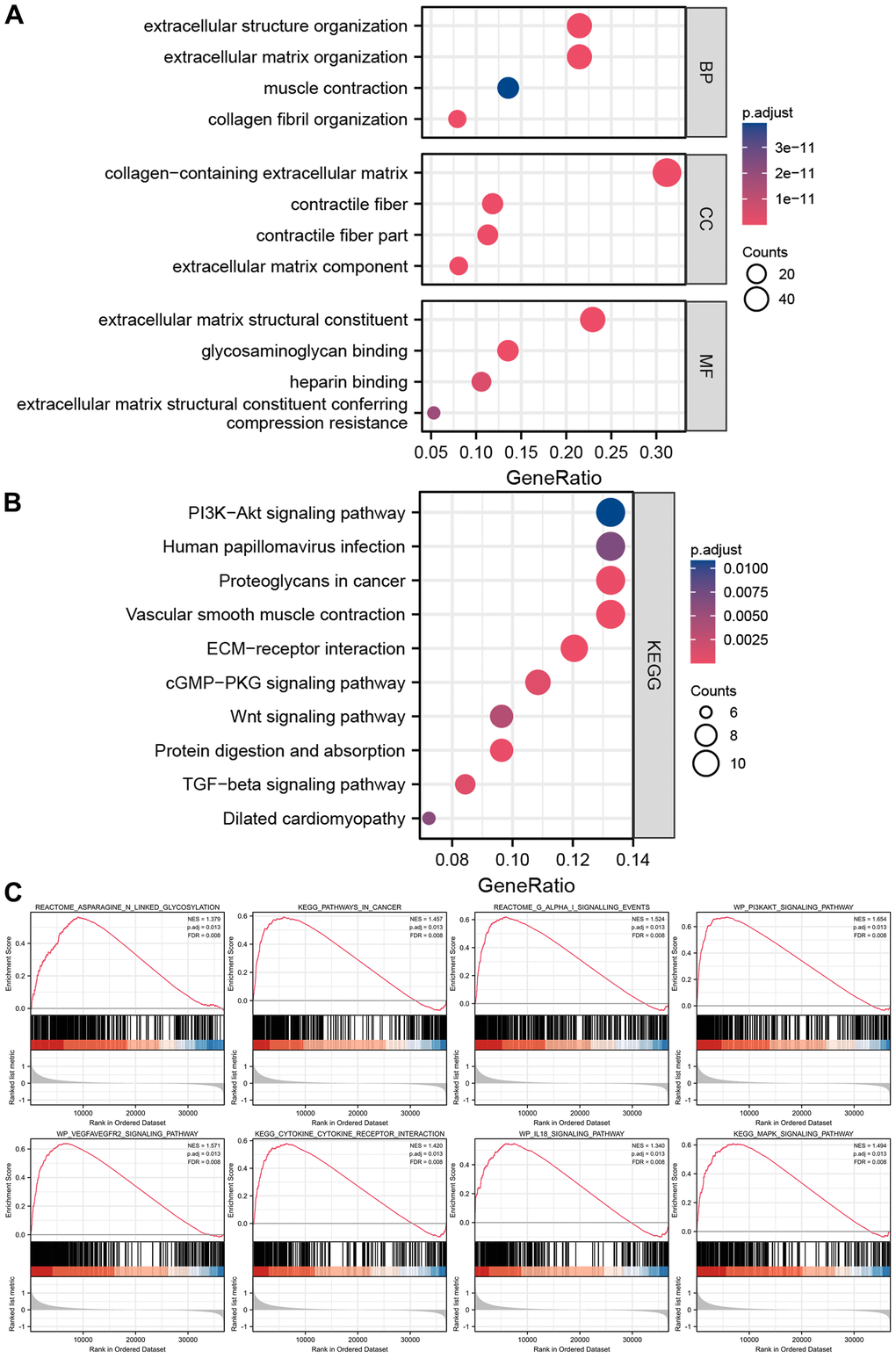 GO and KEGG analyses were utilized to investigate the latent biological roles of DEGs in two groups. As shown in Figure 8A, the DEGs were mostly involved in processes like muscle contraction and other processes. Cellular component analysis revealed the DEGs to be mainly located in the collagen-containing extracellular matrix, contractile fiber, and extracellular matrix components. Molecular function analysis revealed that the DEGs especially participated in intercellular communications. KEGG analysis revealed the DEGs have significant enrichment of the PI3K-Akt pathway, proteoglycans in cancer, ECM-receptor interaction, and cGMP-PKG pathway to modulate tumor progression (Figure 8B). GSEA analysis clarified the molecular mechanisms enriched or depleted in the two groups in the cuproptosis-related immune biomarker signature. Figure 8C shows a significant enrichment of asparagine N-linked glycosylation, pathways in cancer, G alpha (i) signalling events, PI3K-Akt, VEGFA-VEGFR2, IL-18, and MAPK signaling pathway, and cytokine-cytokine receptor interaction in high-risk groups of GC patients.