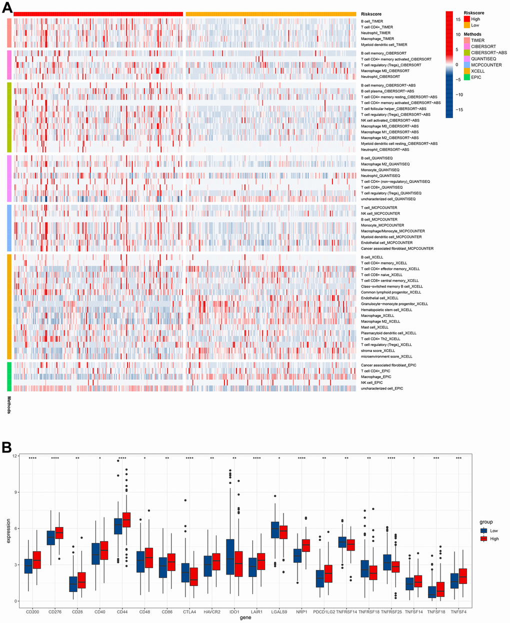 Much research has verified the profound effects of immune infiltration in the TME on tumor progression. Therefore, level of immune infiltration was evaluated using TIMER, CIBERSORT [47], CIBERSORT-ABS, QUANTISEQ, MCPCOUNTER, XCELL, and EPIC datasets. The expression of several critical immune checkpoints in the two groups was also investigated.